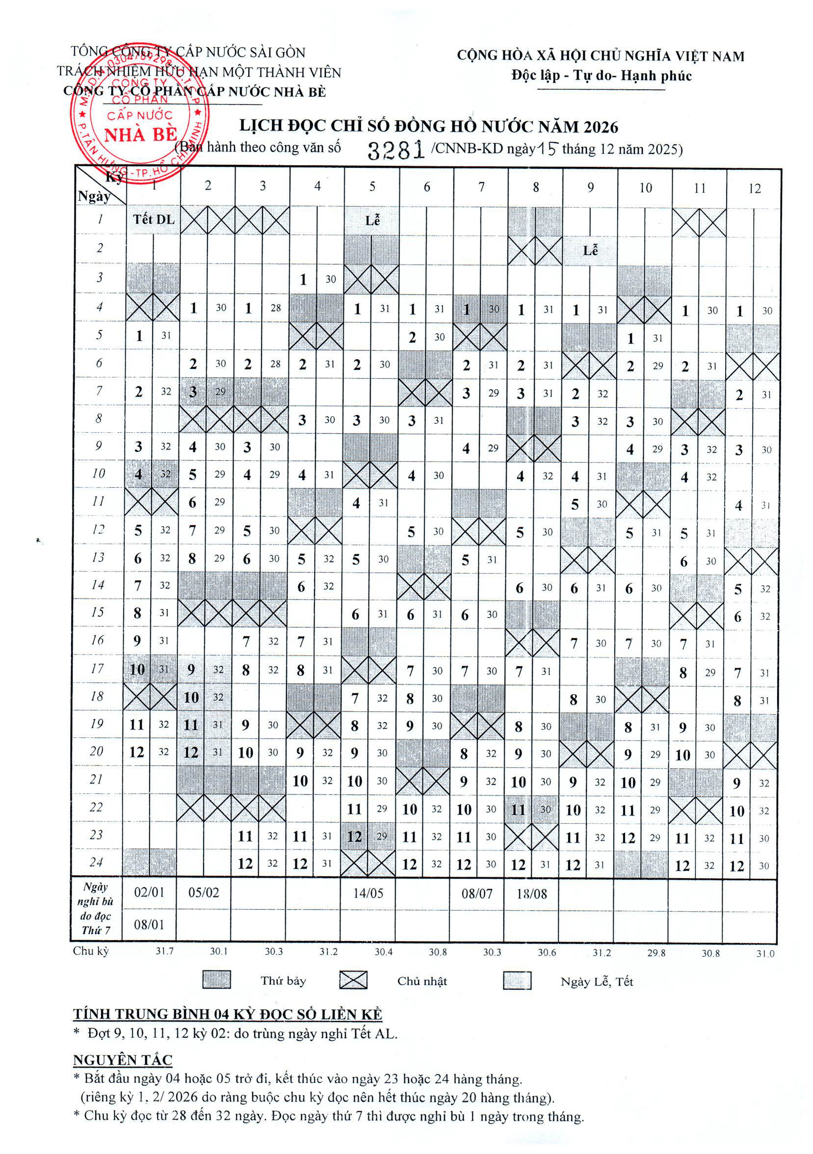 Công ty cổ phần Cấp nước Nhà Bè kính gửi Quý Khách hàng lịch đọc chỉ số đồng hồ nước năm 2026 để tiện theo dõi.