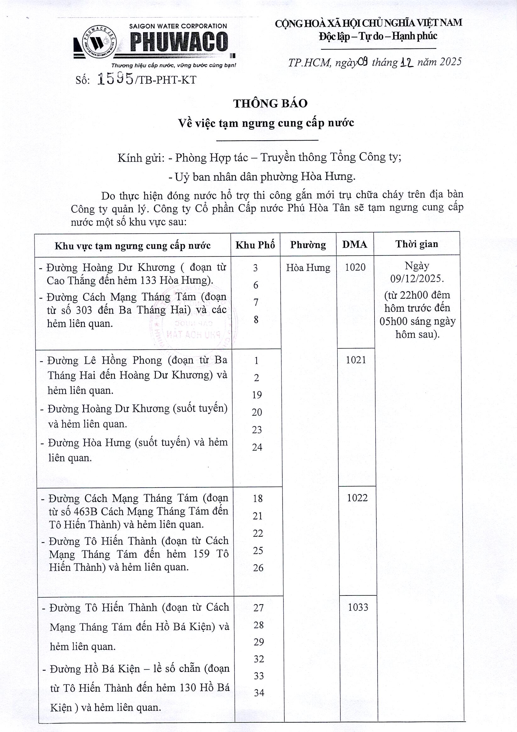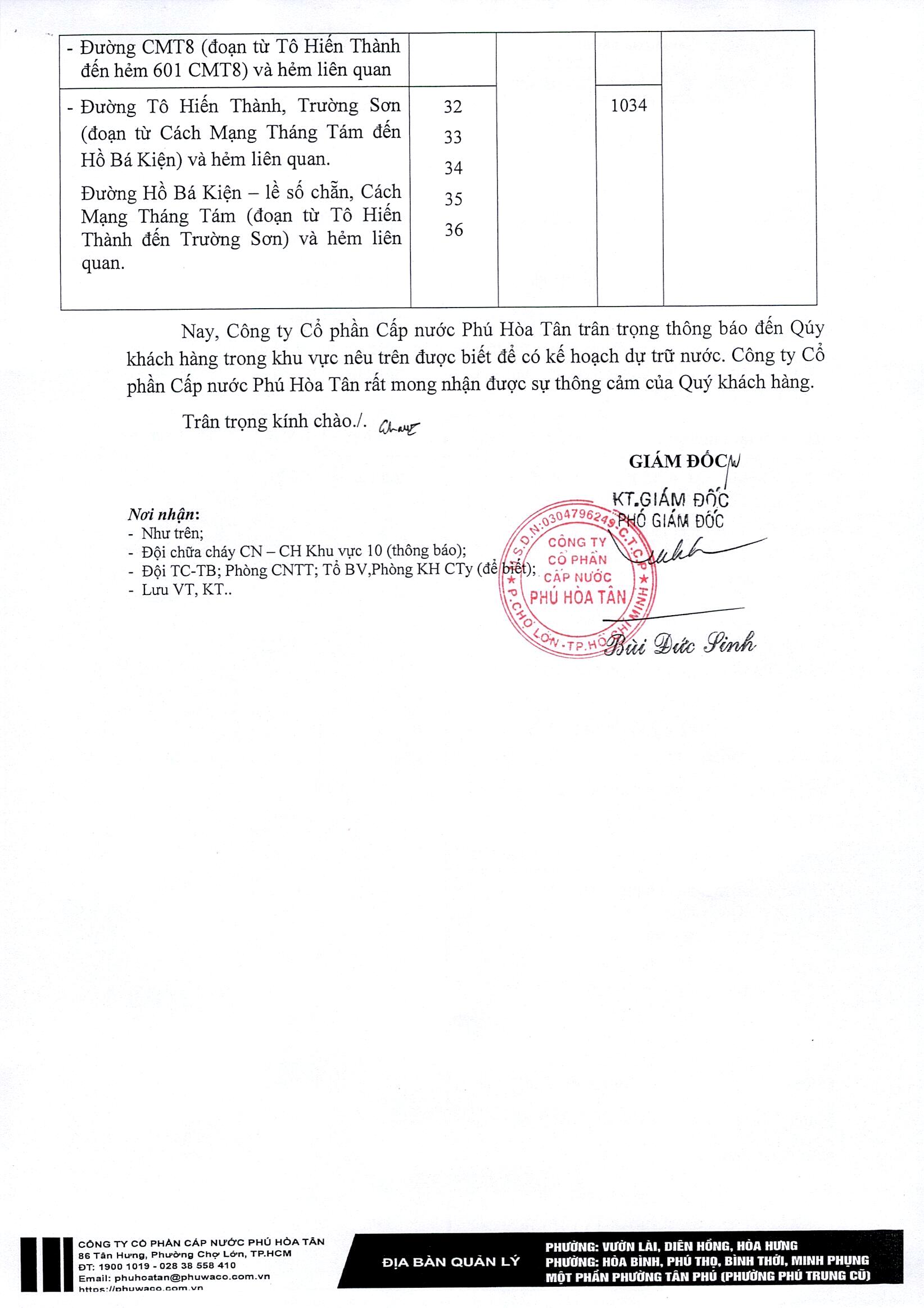 Công ty Cổ phần Cấp nước Phú Hòa Tân trân trọng thông báo Quý khách hàngđược biết để có kế hoạch dự trữ nước phục vụ cho sản xuất và sinh hoạt. Công tyrất mong nhận được sự thông cảm của Quý khách hàng./