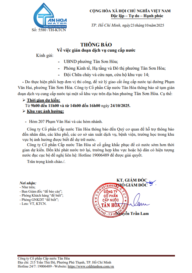 Công ty Cổ phần Cấp nước Tân Hòa thực hiện phối hợp đơn vị thi công, để xử lý giao cắt ống cấp nước tại đường Phạm Văn Hai, phường Tân Sơn Hòa. Công ty Cổ phần Cấp nước Tân Hòa thông báo sẽ tạm gián đoạn dịch vụ cung cấp nước tại một số khu vực trên địa bàn phường Tân Sơn Hòa.