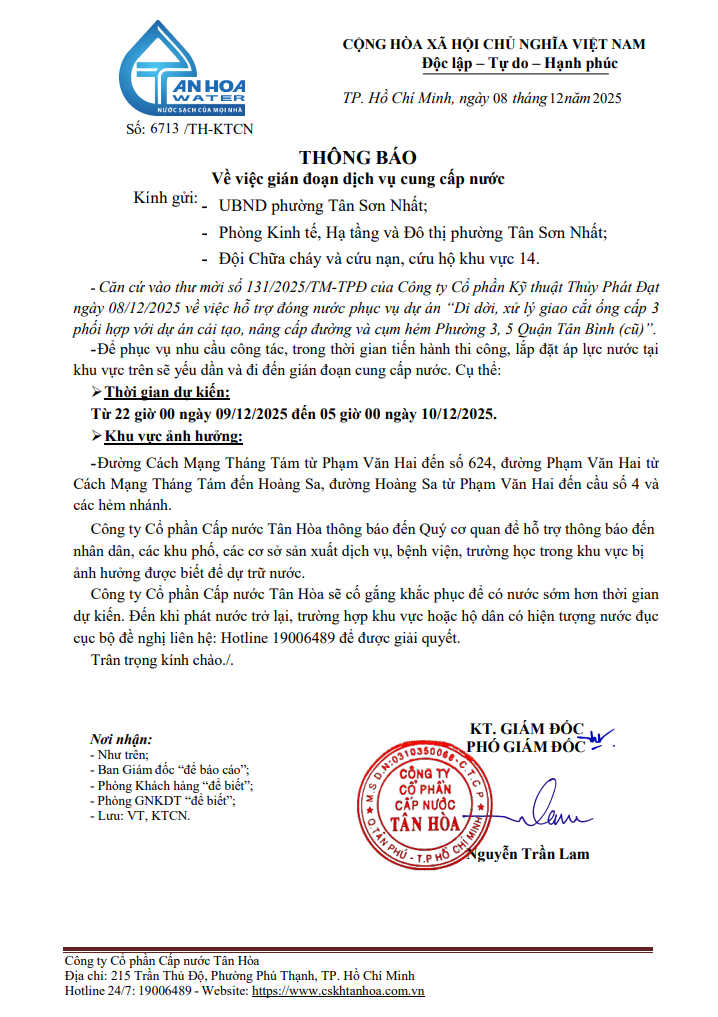 Công ty Cổ phần cấp nước Tân Hòa hỗ trợ đóng nước phục vụ dự án “Di dời, xử lý giao cắt ống cấp 3 phối hợp với dự án cải tạo, nâng cấp đường và cụm hẻm Phường 3, 5 Quận Tân Bình (cũ)”. Để phục vụ nhu cầu công tác, trong thời gian tiến hành thi công, lắp đặt áp lực nước tại khu vực trên sẽ yếu dần và đi đến gián đoạn cung cấp nước.