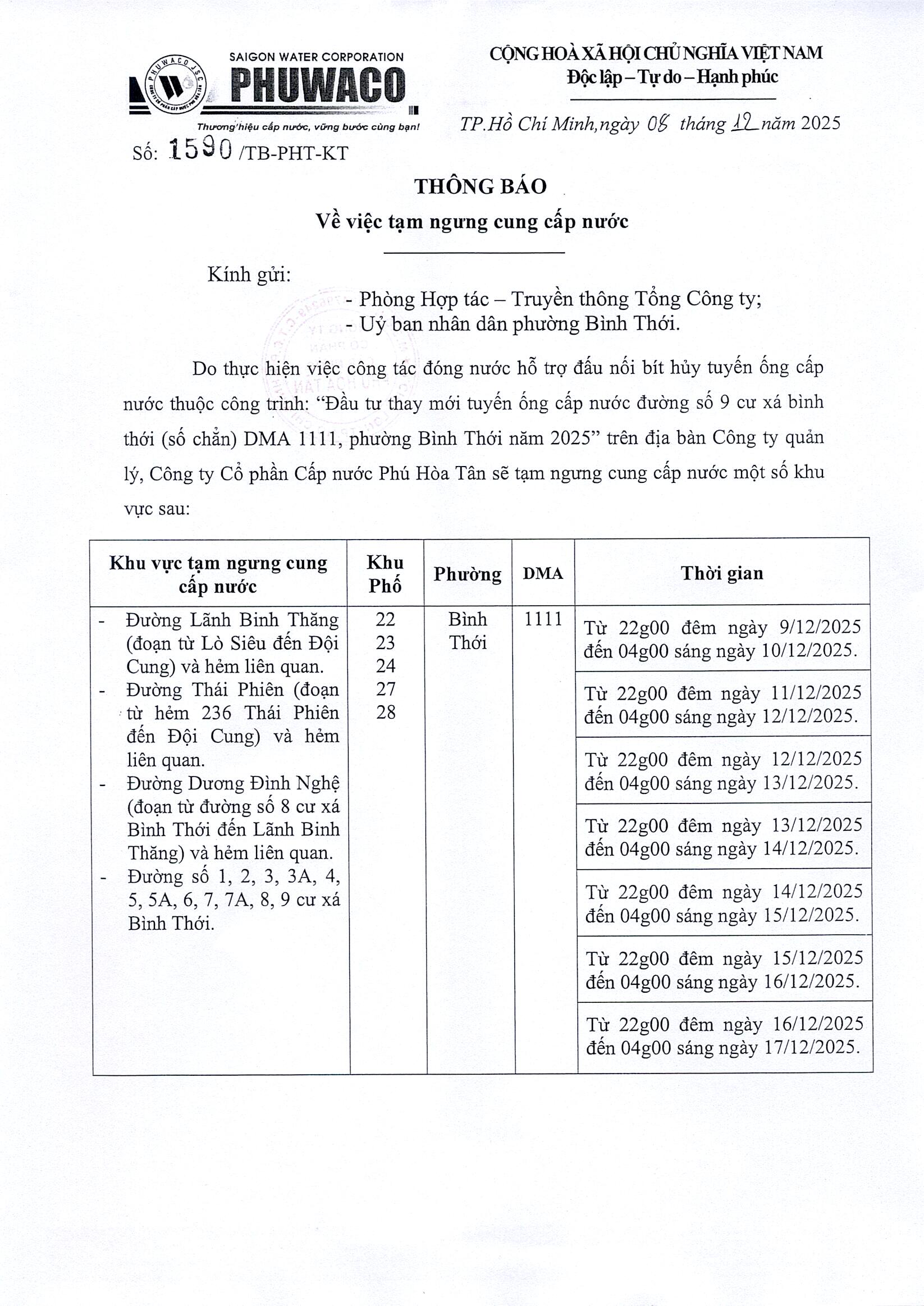 Ảnh: Thông báo tạm ngưng cung cấp nước phường Bình Thới từ 22g00 đến 04g00 các ngày 09, 10, 11, 12, 13, 14, 15, 16, 17/12/2025