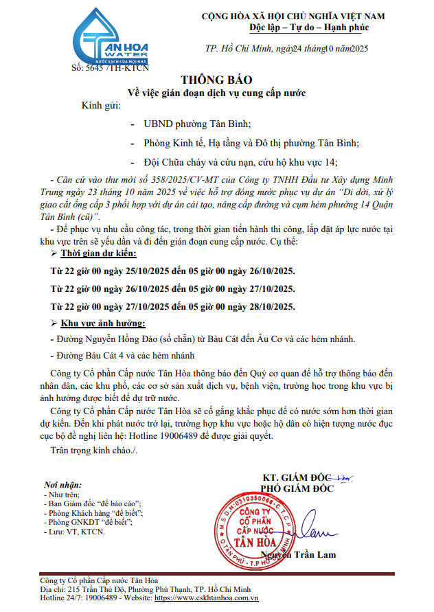 Công ty Cổ phần Cấp nước Tân Hòa hỗ trợ đóng nước phục vụ dự án “Di dời, xử lý giao cắt ống cấp 3 phối hợp với dự án cải tạo, nâng cấp đường và cụm hẻm phường 14 Quận Tân Bình (cũ)”. Để phục vụ nhu cầu công tác, trong thời gian tiến hành thi công, lắp đặt áp lực nước tại khu vực trên sẽ yếu dần và đi đến gián đoạn cung cấp nước.