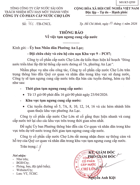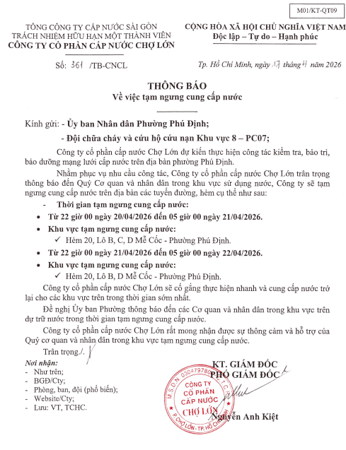 CTCP CN Chợ lớn chân thành xin lỗi Quý khách hàng về sự bất tiện này. Quý khách nên chủ động trong việc sử dụng và dự trữ nước trong thời gian tạm ngưng cung cấp nước.