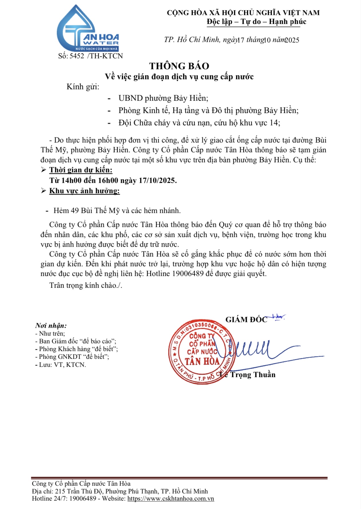 Công ty Cổ phần Cấp nước Tân Hoà thực hiện phối hợp đơn vị thi công, để xử lý giao cắt ống cấp nước tại đường Bùi Thế Mỹ, phường Bảy Hiền. Công ty Cổ phần Cấp nước Tân Hòa thông báo sẽ tạm gián đoạn dịch vụ cung cấp nước tại một số khu vực trên địa bàn phường Bảy Hiền.