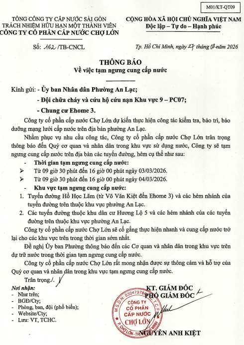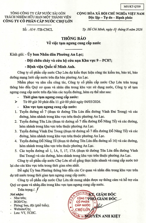 CTCP CN Chợ lớn chân thành xin lỗi Quý khách hàng về sự bất tiện này. Quý khách nên chủ động trong việc sử dụng và dự trữ nước trong thời gian tạm ngưng cung cấp nước.