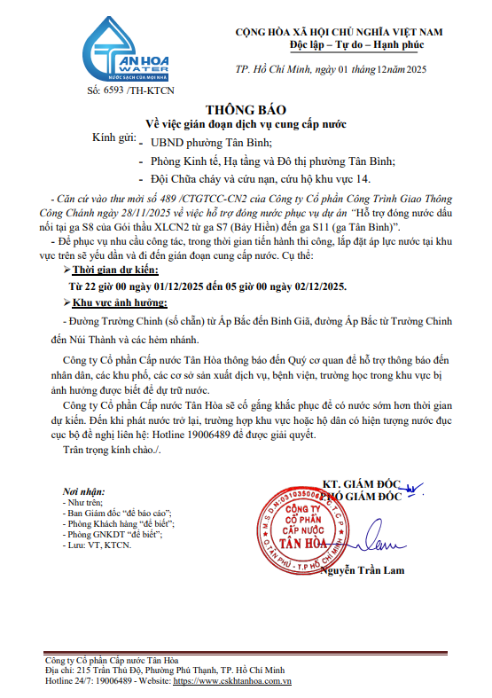 Công ty Cổ phần Cấp nước Tân Hoà hỗ trợ đóng nước phục vụ dự án “Hỗ trợ đóng nước dấu nối tại ga S8 của Gói thầu XLCN2 từ ga S7 (Bảy Hiền) đến ga S11 (ga Tân Bình)”. Để phục vụ nhu cầu công tác, trong thời gian tiến hành thi công, lắp đặt áp lực nước tại khu vực trên sẽ yếu dần và đi đến gián đoạn cung cấp nước.