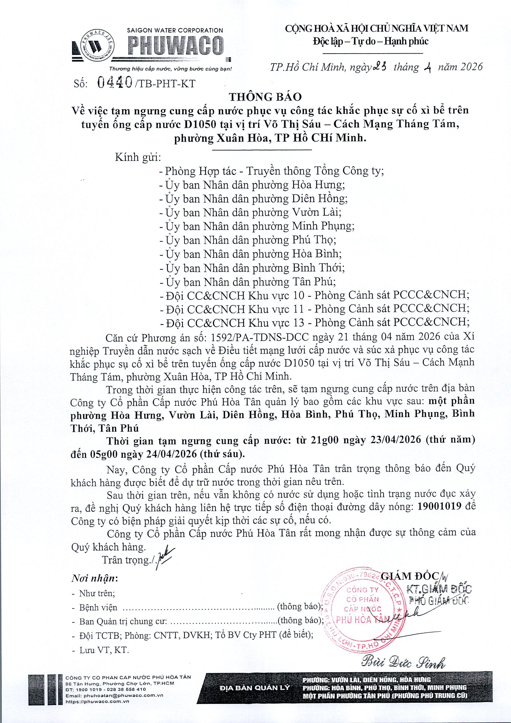 Công ty Cổ phần Cấp nước Phú Hòa Tân trân trọng thông báo Quý khách hàngđược biết để có kế hoạch dự trữ nước phục vụ cho sản xuất và sinh hoạt. Công tyrất mong nhận được sự thông cảm của Quý khách hàng./