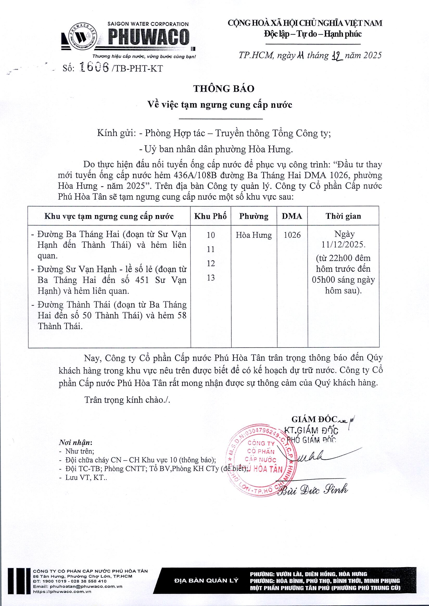 Công ty Cổ phần Cấp nước Phú Hòa Tân trân trọng thông báo Quý khách hàngđược biết để có kế hoạch dự trữ nước phục vụ cho sản xuất và sinh hoạt. Công tyrất mong nhận được sự thông cảm của Quý khách hàng./