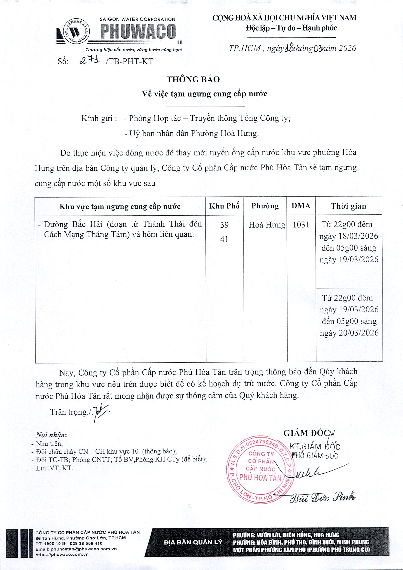 Công ty Cổ phần Cấp nước Phú Hòa Tân trân trọng thông báo Quý khách hàngđược biết để có kế hoạch dự trữ nước phục vụ cho sản xuất và sinh hoạt. Công tyrất mong nhận được sự thông cảm của Quý khách hàng./