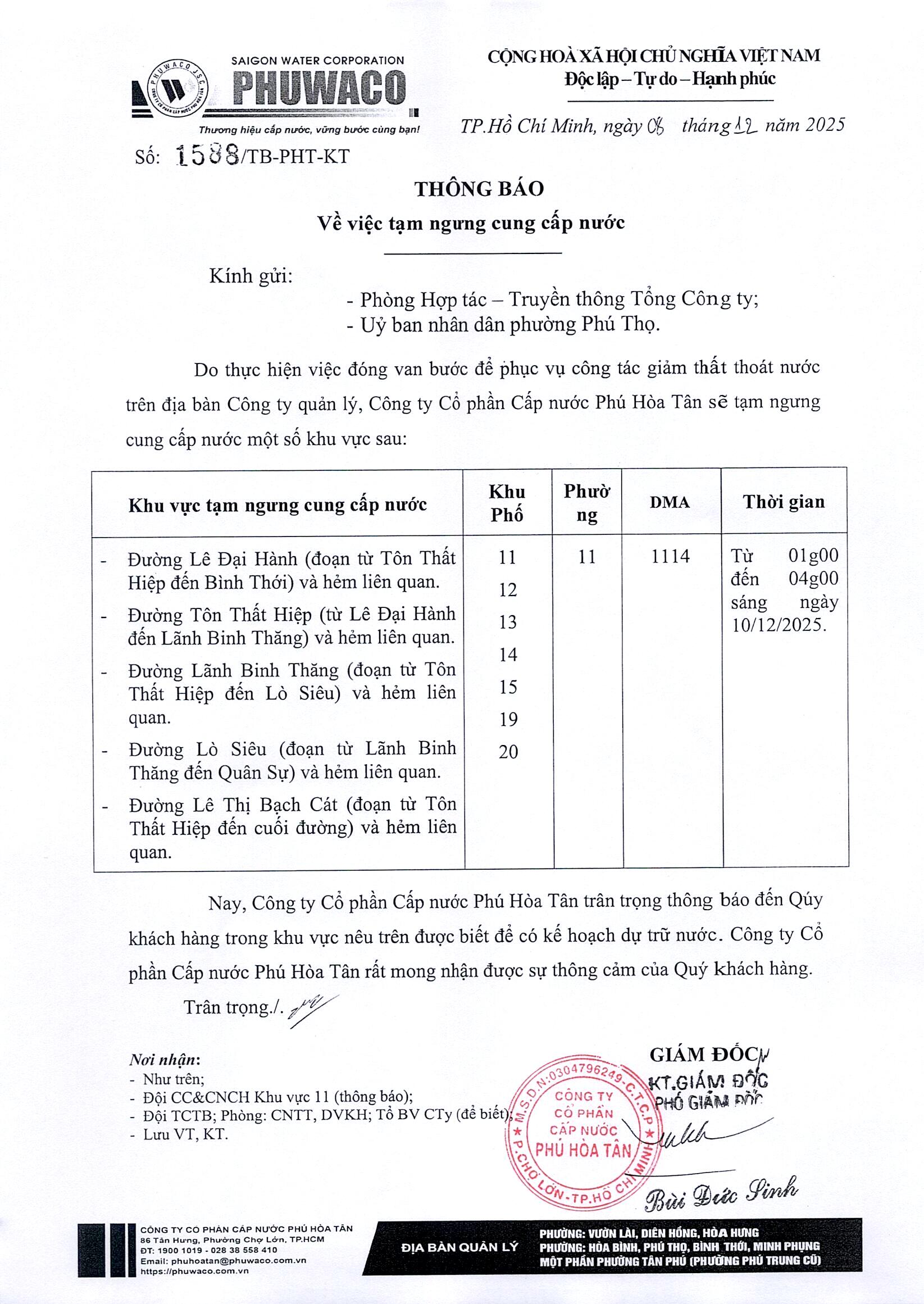 CTCP CN Phú Hòa Tân chân thành xin lỗi Quý khách hàng về sự bất tiện này. Quý khách nên chủ động trong việc sử dụng và dự trữ nước trong thời gian tạm ngưng cung cấp nước.