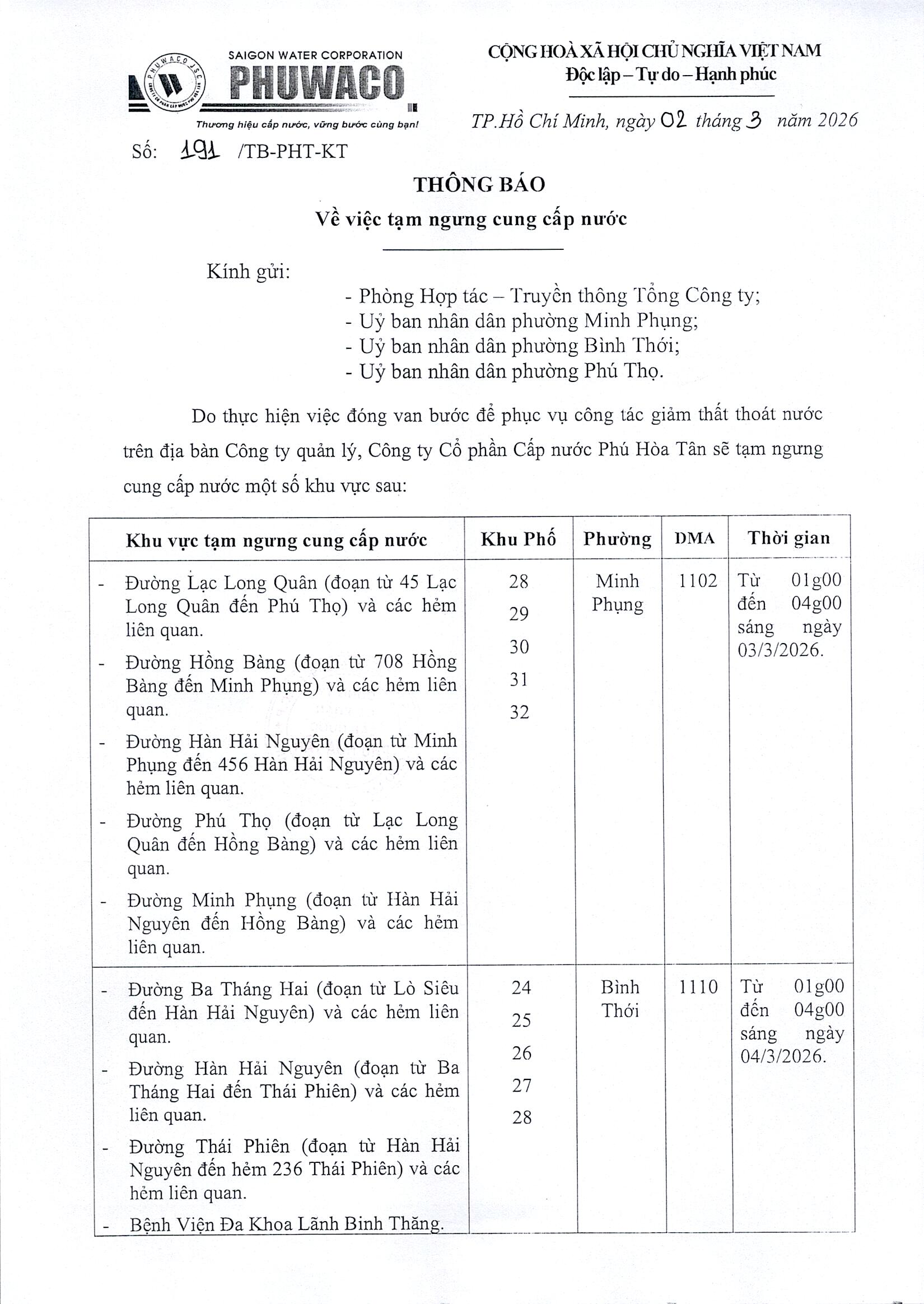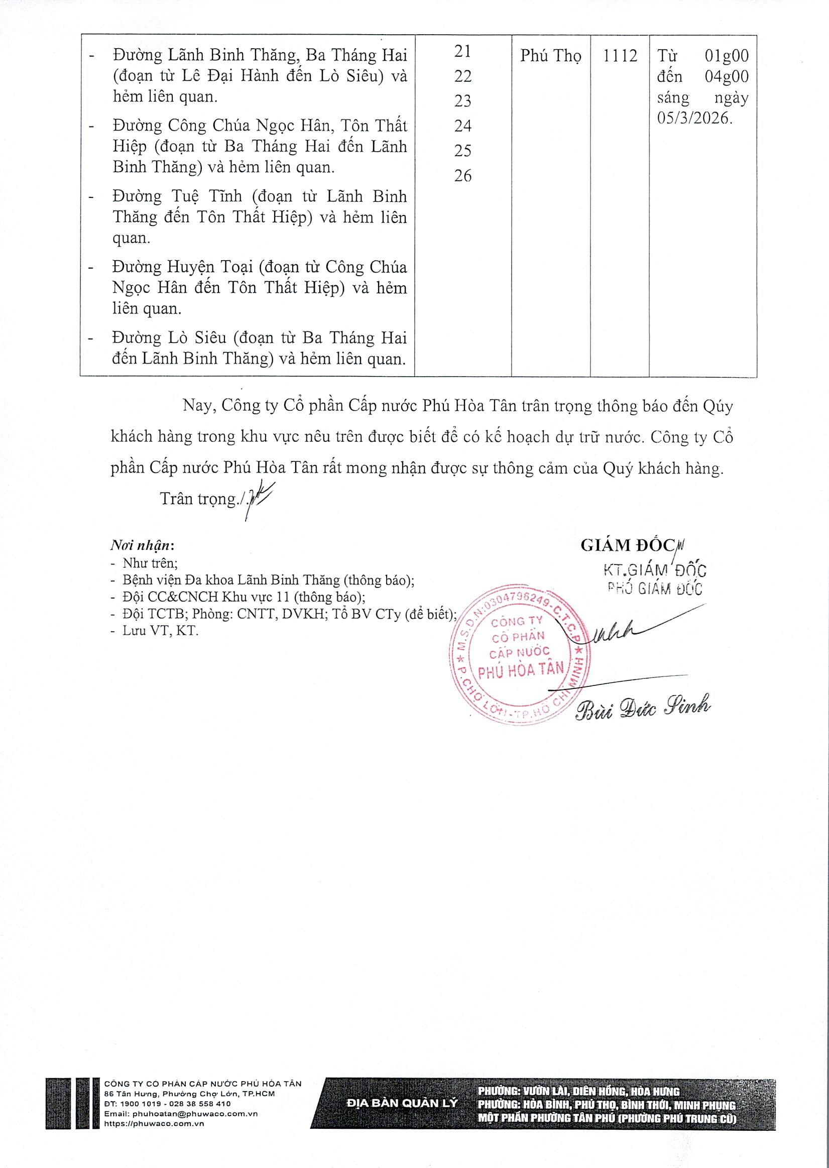 Công ty Cổ phần Cấp nước Phú Hòa Tân trân trọng thông báo Quý khách hàngđược biết để có kế hoạch dự trữ nước phục vụ cho sản xuất và sinh hoạt. Công tyrất mong nhận được sự thông cảm của Quý khách hàng./