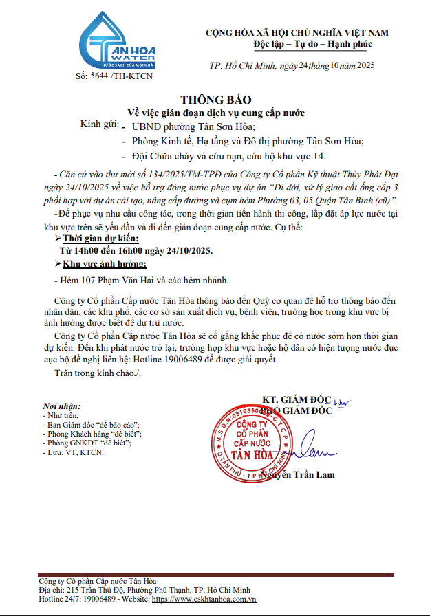 Về việc gián đoạn dịch vụ cung cấp nước một số khu vực Phường Tân Sơn Hòa. Từ 14h đến 16h ngày 24/10/2025.