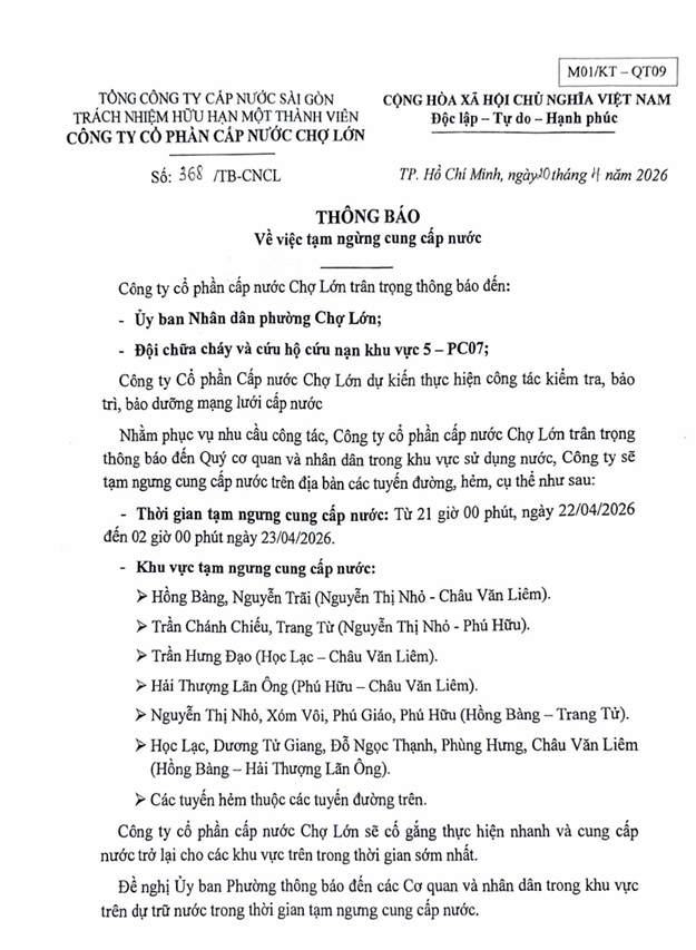 Lịch thông báo tạm ngưng cung cấp nước khu vực thuộc phường CHỢ LỚN từ 21g00 ngày 22/04/2026 - 02g00 ngày 23/04/2026