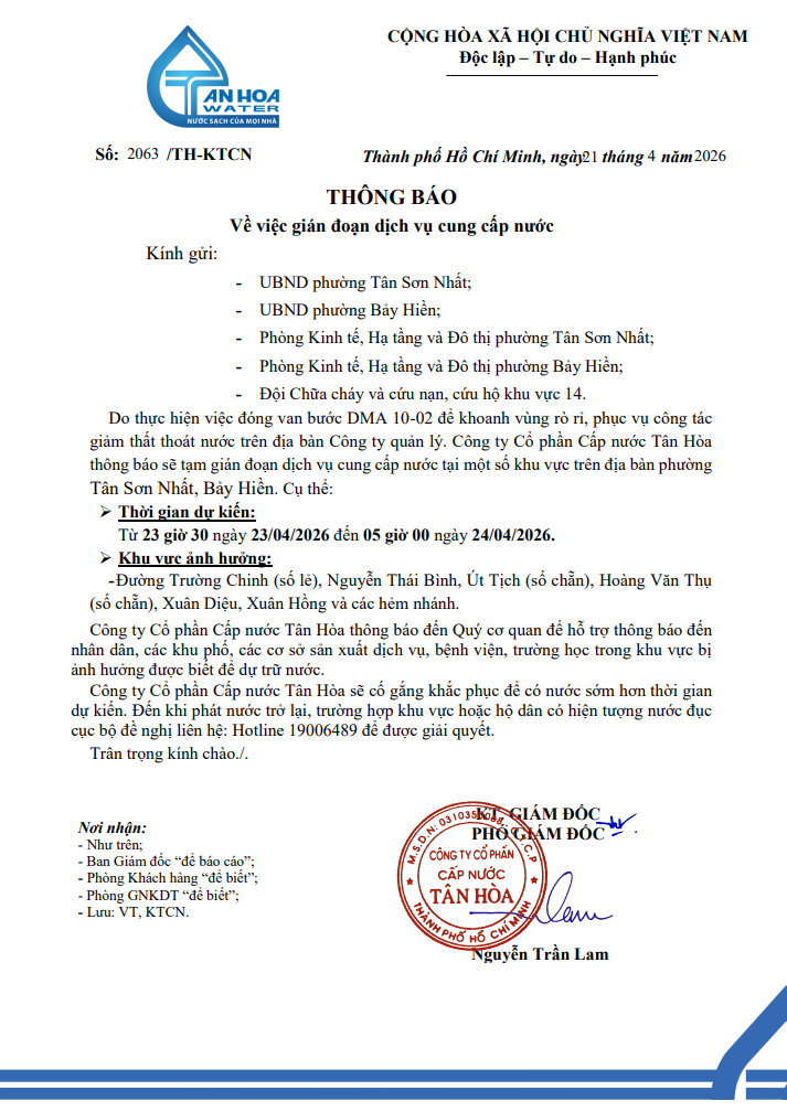 Công ty Cổ phần Cấp nước Tân Hòa thực hiện việc đóng van bước DMA 10-02 để khoanh vùng rò rỉ, phục vụ công tác giảm thất thoát nước trên địa bàn Công ty quản lý. Công ty Cổ phần Cấp nước Tân Hòa thông báo sẽ tạm gián đoạn dịch vụ cung cấp nước tại một số khu vực trên địa bàn phường Tân Sơn Nhất, Bảy Hiền.