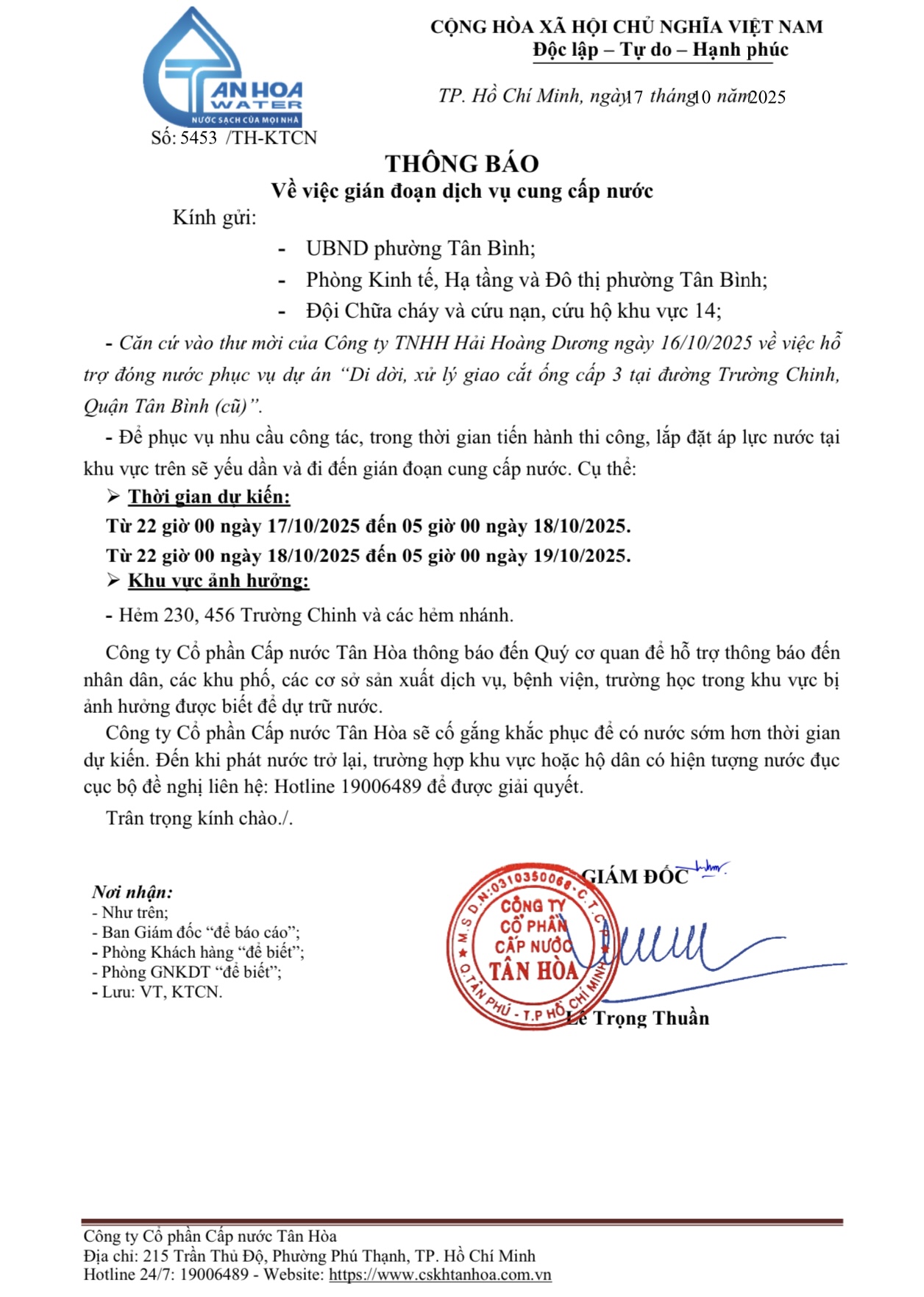 CTCP CN Tân Hòa chân thành xin lỗi Quý khách hàng về sự bất tiện này. Quý khách nên chủ động trong việc sử dụng và dự trữ nước trong thời gian tạm ngưng cung cấp nước.