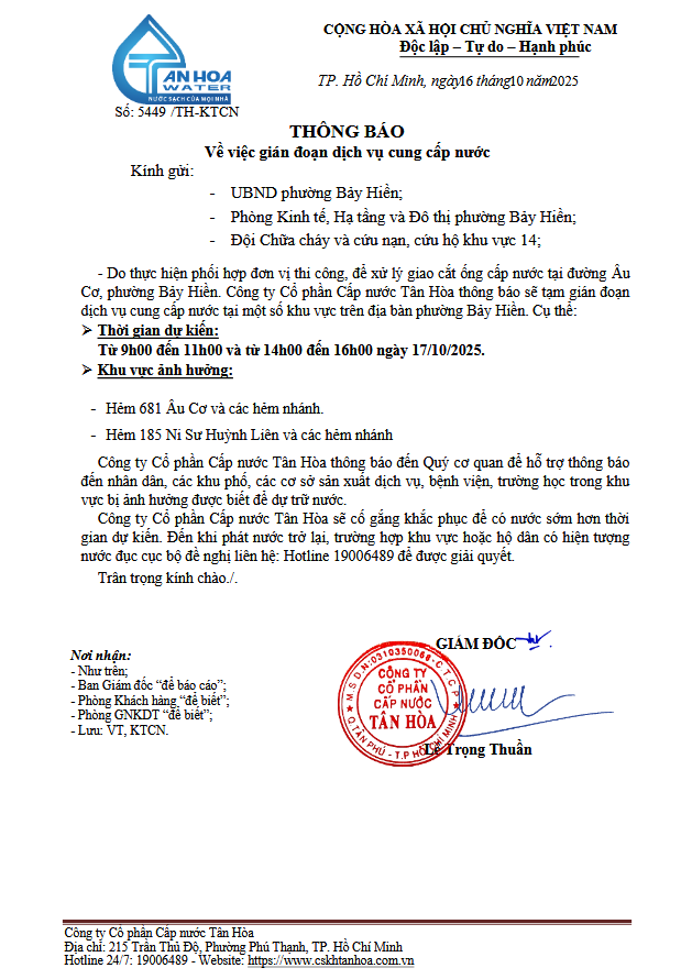 Công ty Cổ phần Cấp nước Tân Hòa thực hiện phối hợp đơn vị thi công, để xử lý giao cắt ống cấp nước tại đường Âu Cơ, phường Bảy Hiền. Công ty Cổ phần Cấp nước Tân Hòa thông báo sẽ tạm gián đoạn dịch vụ cung cấp nước tại một số khu vực trên địa bàn phường Bảy Hiền.
