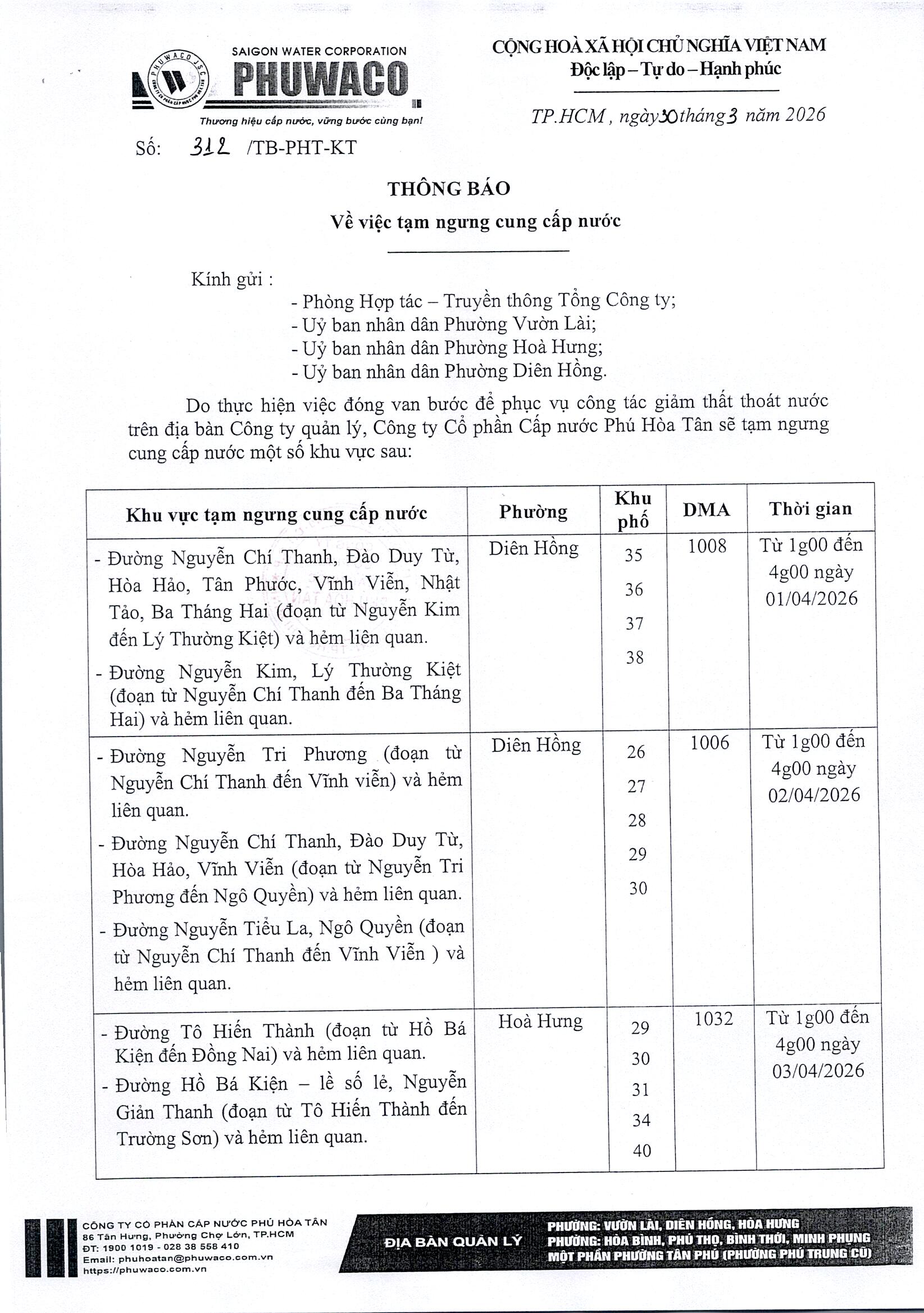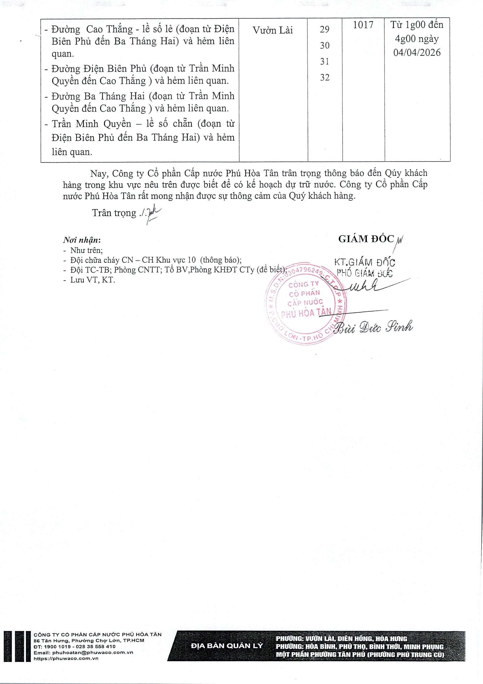 Công ty Cổ phần Cấp nước Phú Hòa Tân trân trọng thông báo Quý khách hàngđược biết để có kế hoạch dự trữ nước phục vụ cho sản xuất và sinh hoạt. Công tyrất mong nhận được sự thông cảm của Quý khách hàng./
