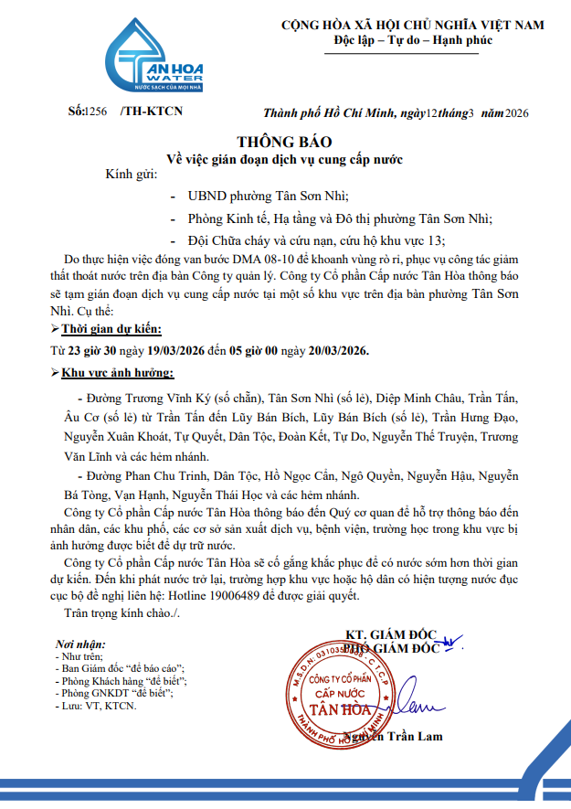 Công ty Cổ phần Cấp nước Tân Hòa thực hiện việc đóng van bước DMA 08-10 để khoanh vùng rò rỉ, phục vụ công tác giảm thất thoát nước trên địa bàn Công ty quản lý. Công ty Cổ phần Cấp nước Tân Hòa thông báo sẽ tạm gián đoạn dịch vụ cung cấp nước tại một số khu vực trên địa bàn phường Tân Sơn Nhì.