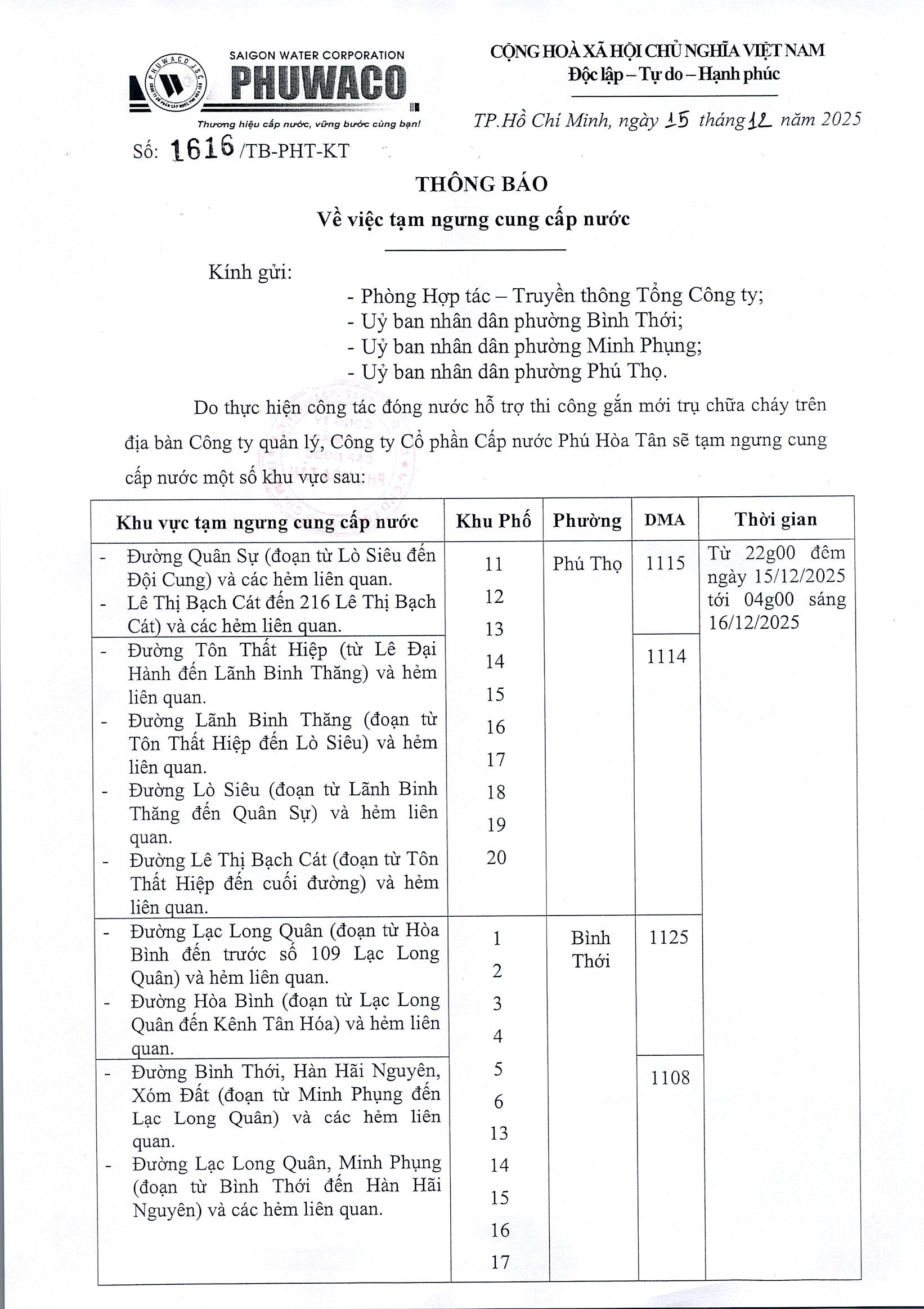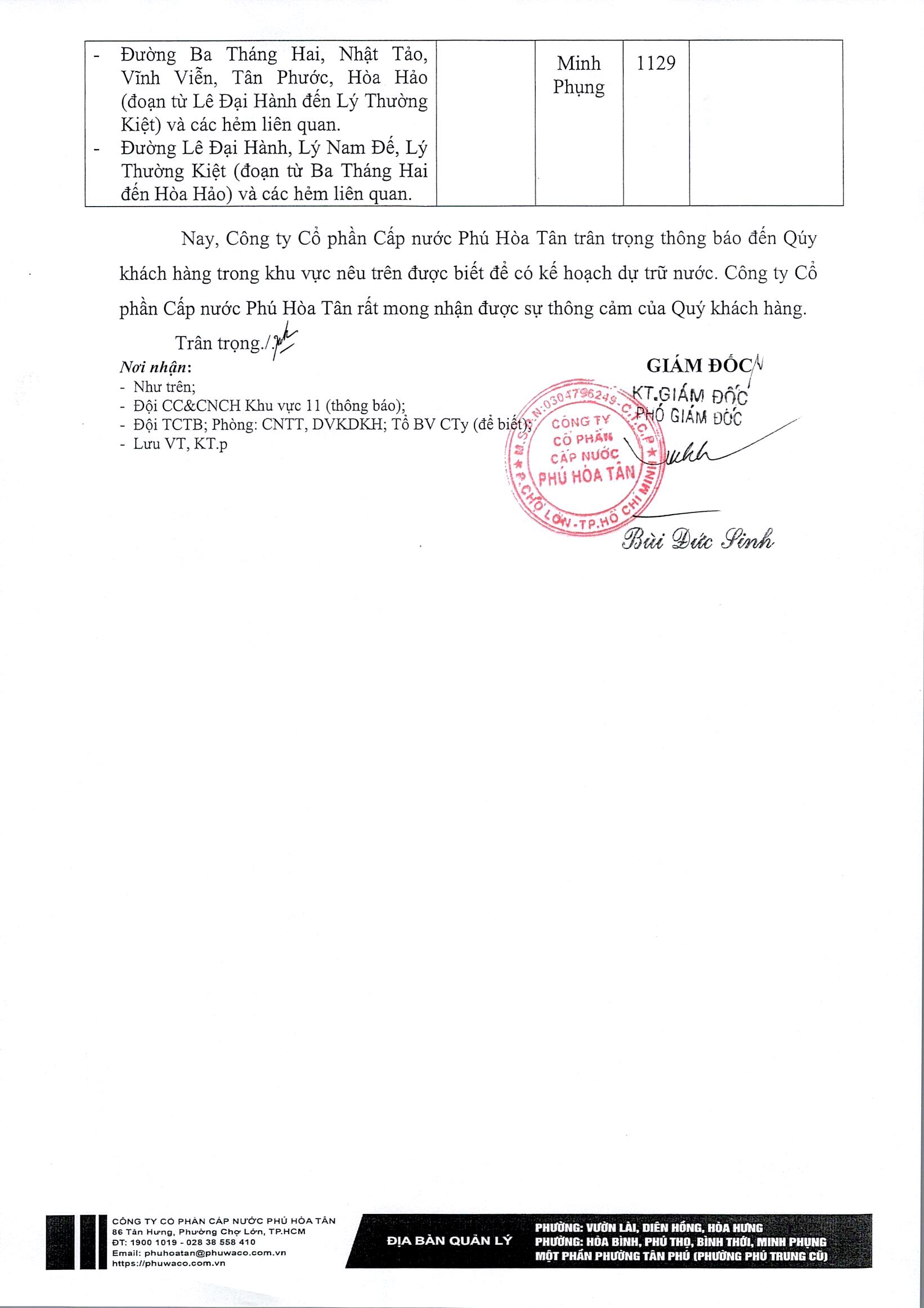 Công ty Cổ phần Cấp nước Phú Hòa Tân trân trọng thông báo Quý khách hàngđược biết để có kế hoạch dự trữ nước phục vụ cho sản xuất và sinh hoạt. Công tyrất mong nhận được sự thông cảm của Quý khách hàng./
