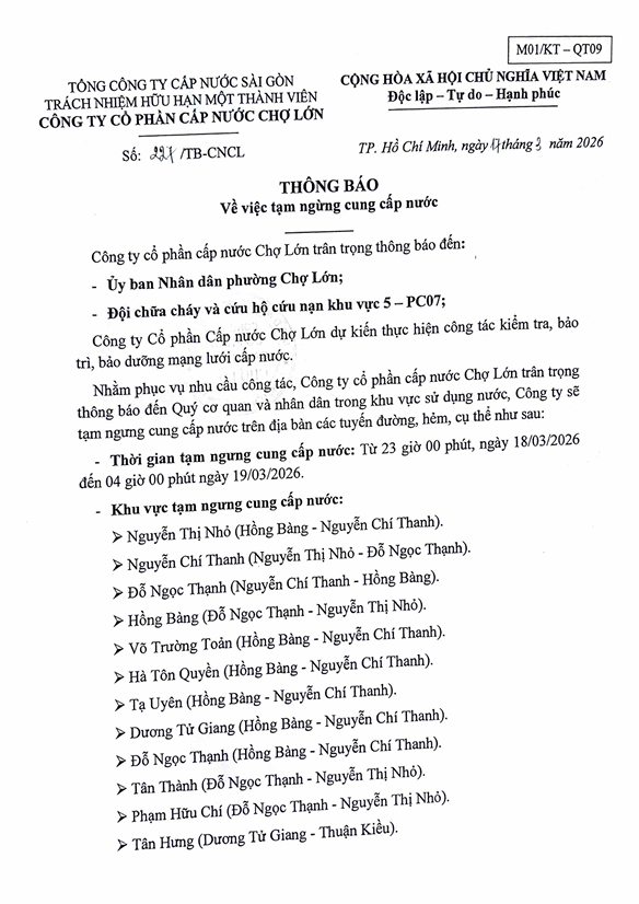Lịch thông báo tạm ngưng cung cấp nước khu vực thuộc phường CHỢ LỚN từ 23g00 ngày 18/03/2026 - 04g00 ngày 19/03/2026