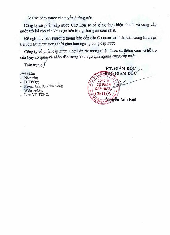 CTCP CN Chợ lớn chân thành xin lỗi Quý khách hàng về sự bất tiện này. Quý khách nên chủ động trong việc sử dụng và dự trữ nước trong thời gian tạm ngưng cung cấp nước.