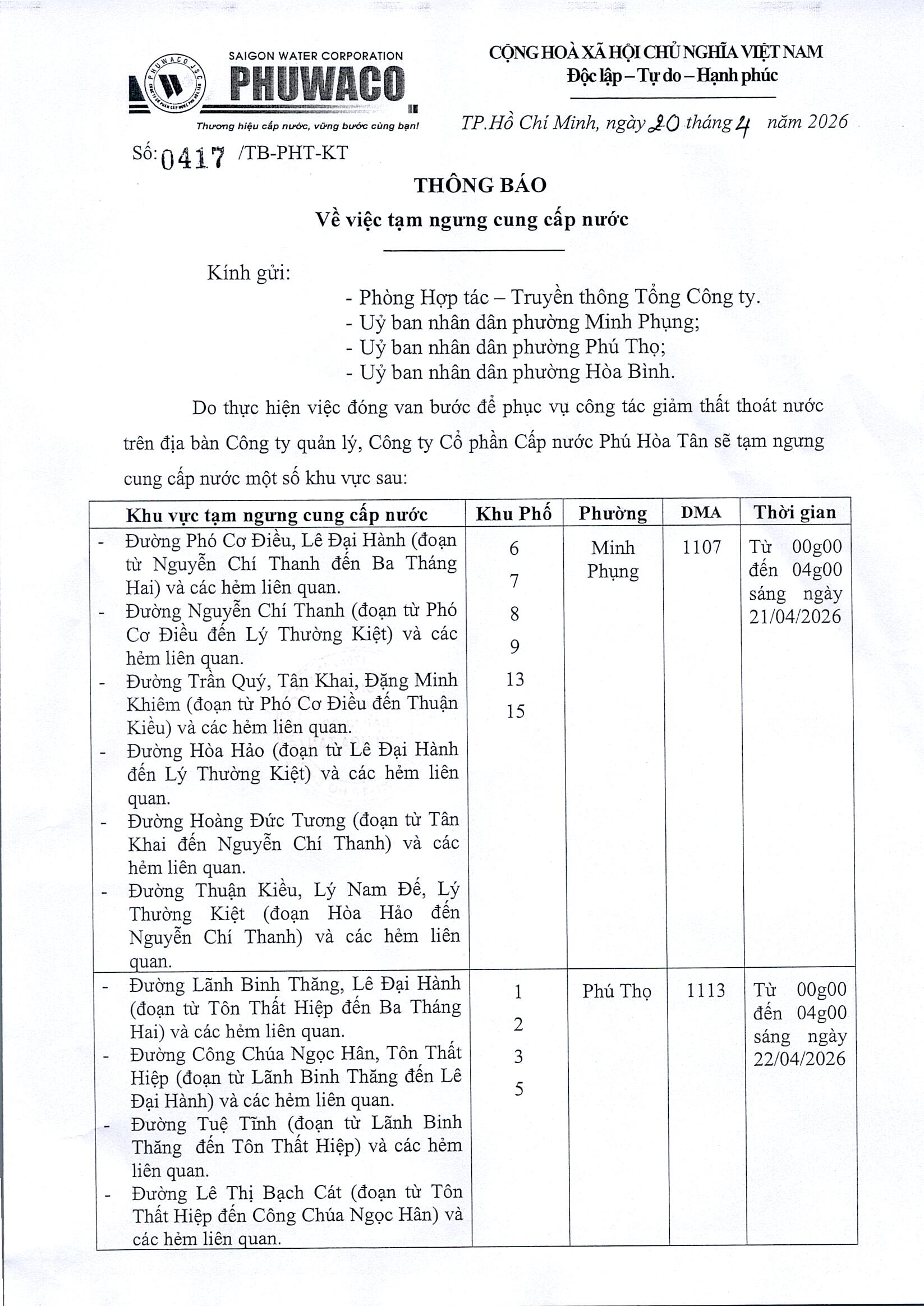 Ảnh: Thông báo tạm ngưng cung cấp nước phường Minh Phụng, Phú Thọ, Hoà Bình từ 0g00 đến 04g00 các ngày 21, 22, 23, 24/4/2026