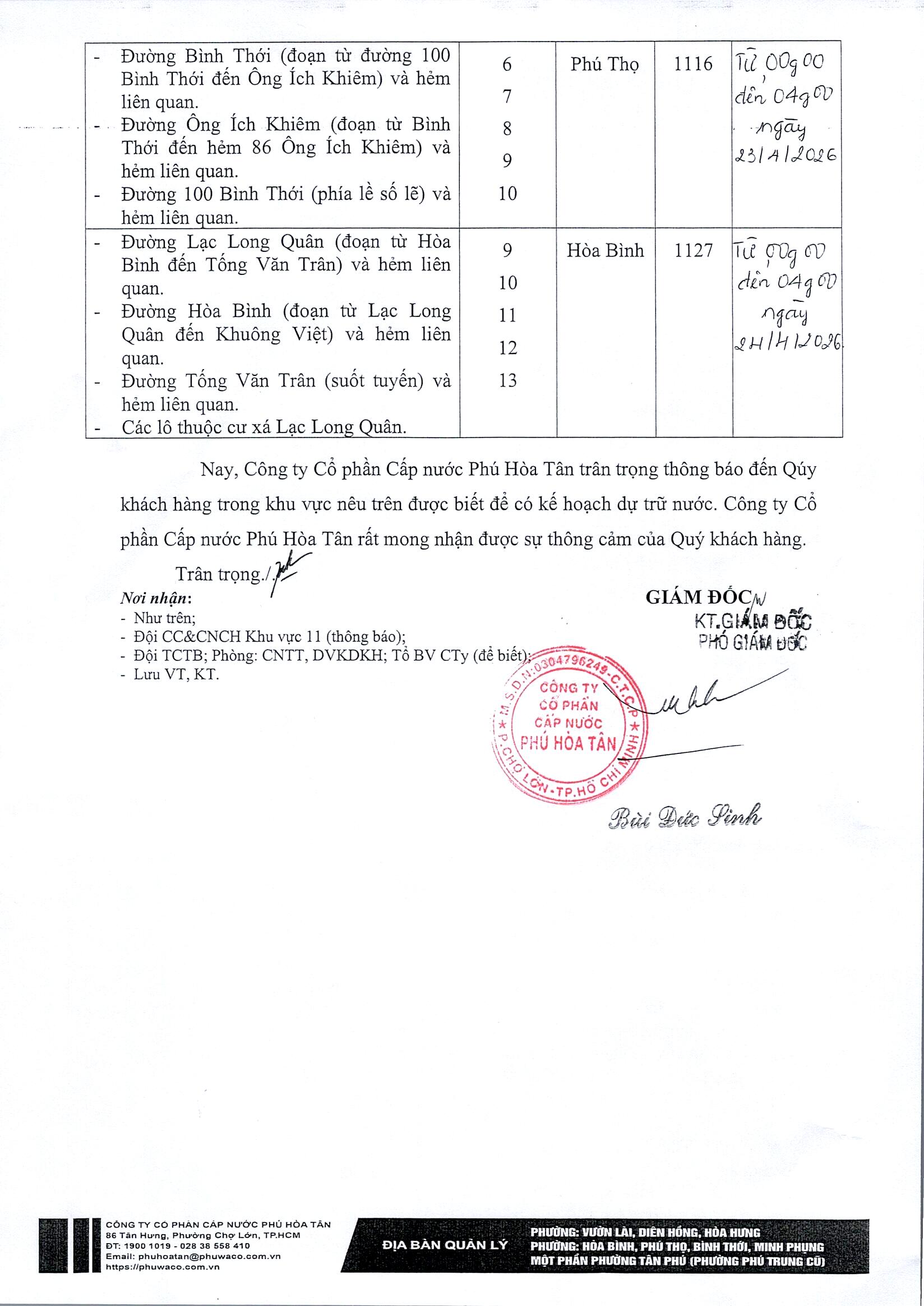 Công ty Cổ phần Cấp nước Phú Hòa Tân trân trọng thông báo Quý khách hàngđược biết để có kế hoạch dự trữ nước phục vụ cho sản xuất và sinh hoạt. Công tyrất mong nhận được sự thông cảm của Quý khách hàng./