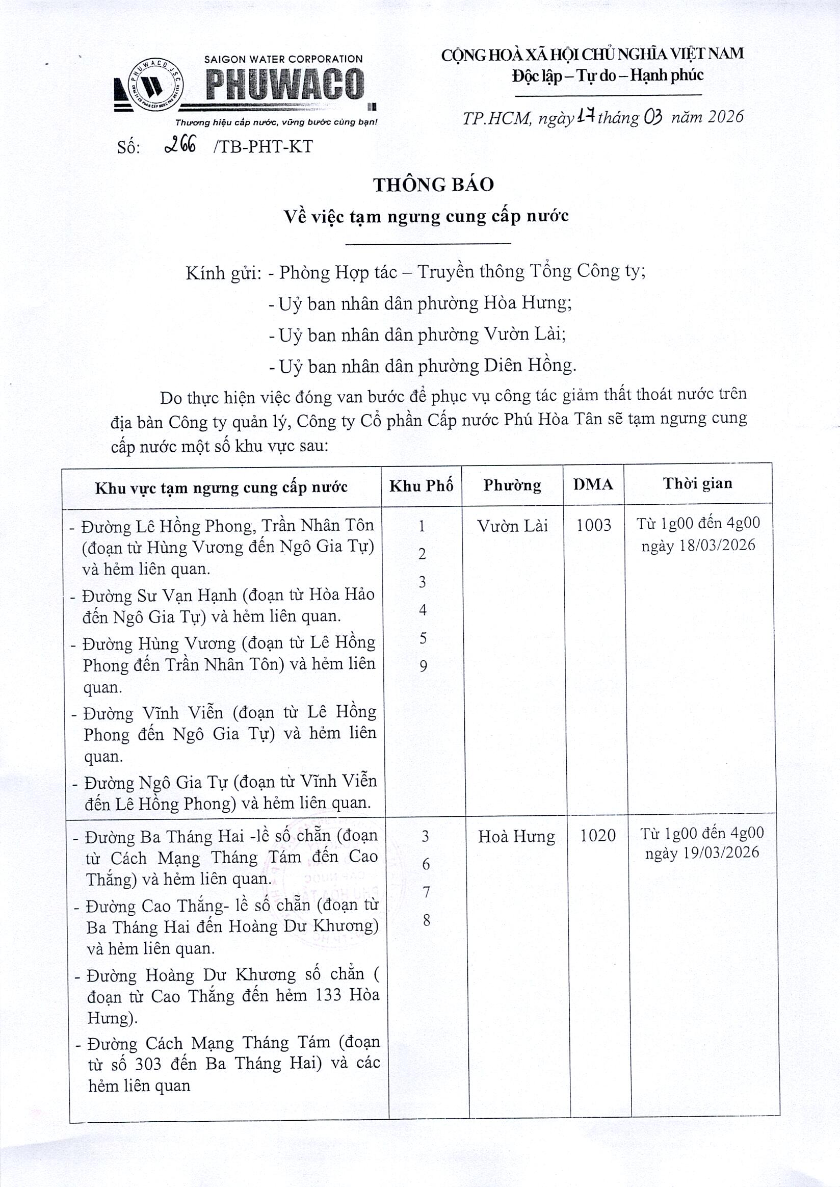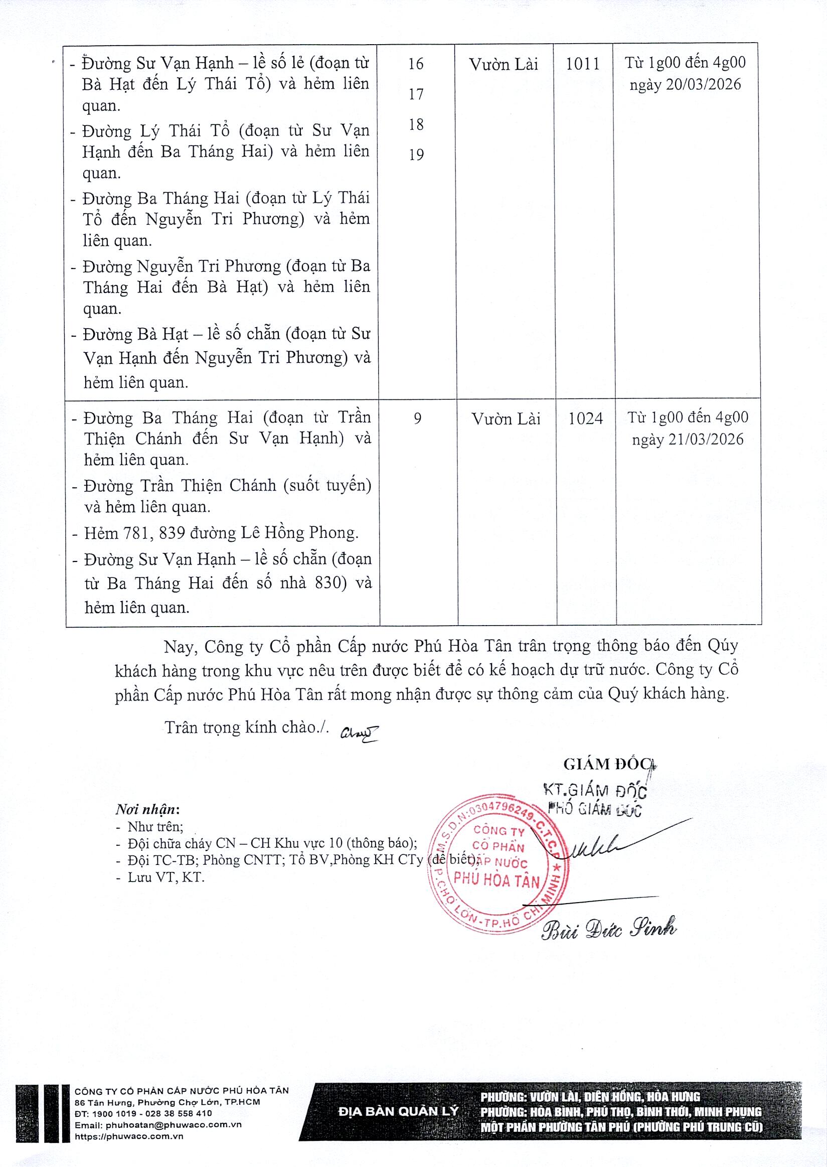 Công ty Cổ phần Cấp nước Phú Hòa Tân trân trọngthông báo Quý khách hàng được biết để có kế hoạch dự trữ nước phục vụ cho sảnxuất và sinh hoạt. Công ty rất mong nhận được sự thông cảm của Quý khách hàng./