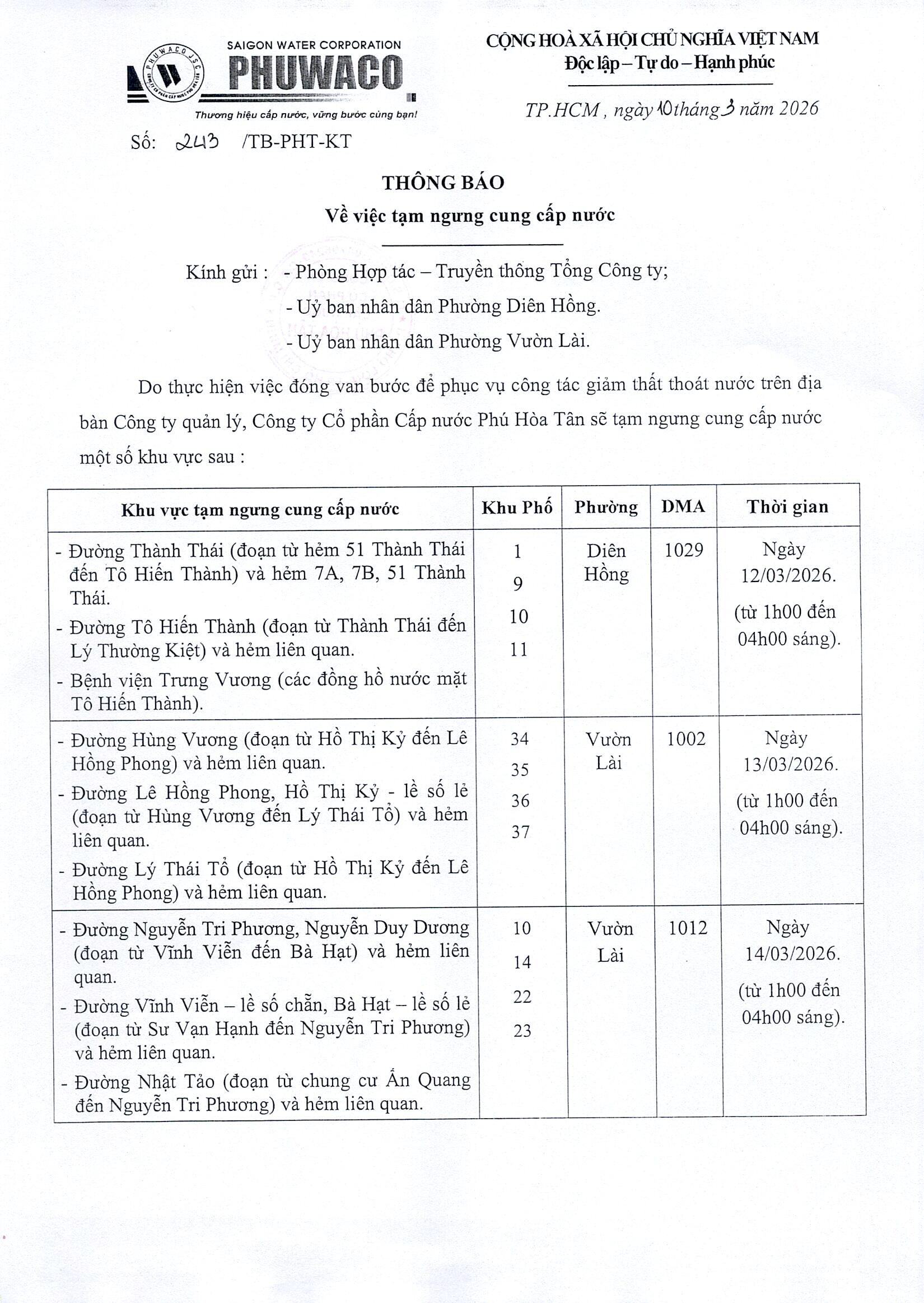 Ảnh: Thông báo tạm ngưng cung cấp nước phường Diên Hồng, Vườn  Lài từ 01g00 đến 04g00 các ngày 12, 13, 14/3/2026