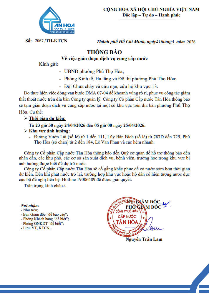 Công ty Cổ phần Cấp nước Tân Hòa thực hiện việc đóng van bước DMA 07-04 để khoanh vùng rò rỉ, phục vụ công tác giảm thất thoát nước trên địa bàn Công ty quản lý. Công ty Cổ phần Cấp nước Tân Hòa thông báo sẽ tạm gián đoạn dịch vụ cung cấp nước tại một số khu vực trên địa bàn phường Phú Thọ Hòa.