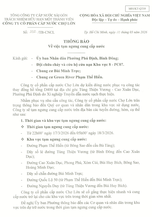Lịch thông báo tạm ngưng cung cấp nước khu vực thuộc phường BÌNH ĐÔNG, PHÚ ĐỊNH từ 22g00 ngày 17/03/2026 đến 05g00 ngày hôm sau