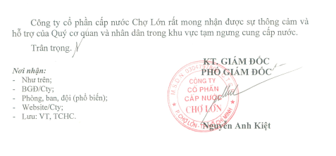 CTCP CN Chợ lớn chân thành xin lỗi Quý khách hàng về sự bất tiện này. Quý khách nên chủ động trong việc sử dụng và dự trữ nước trong thời gian tạm ngưng cung cấp nước.