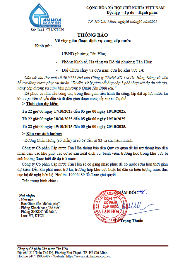 Công ty Cổ phần Cấp nước Tân Hòa hỗ trợ đóng nước phục vụ dự án “Di dời, xử lý giao cắt ống cấp 3 phối hợp với dự án cải tạo, nâng cấp đường và cụm hẻm phường 6 Quận Tân Bình (cũ)”. Để phục vụ nhu cầu công tác, trong thời gian tiến hành thi công, lắp đặt áp lực nước tại khu vực trên sẽ yếu dần và đi đến gián đoạn cung cấp nước.