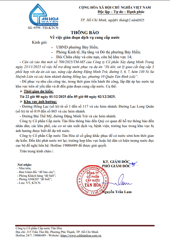 Công ty Cổ phần Cấp nước Tân Hoà hỗ trợ đóng nước phục vụ dự án "Di dời, xử lý giao cắt ống cấp 3 phối hợp với dự án cải tạo, nâng cấp đường Đặng Minh Trứ, đường 5, 6, 7, hẻm 130 Ni Sư Huỳnh Liên và các hẻm nhánh đường Hồng lạc, phường 10 Quận Tân Bình (cũ)". Để phục vụ nhu cầu công tác, trong thời gian tiến hành thi công, lắp đặt áp lực nước tại khu vực trên sẽ yếu dần và đi đến gián đoạn cung cấp nước.