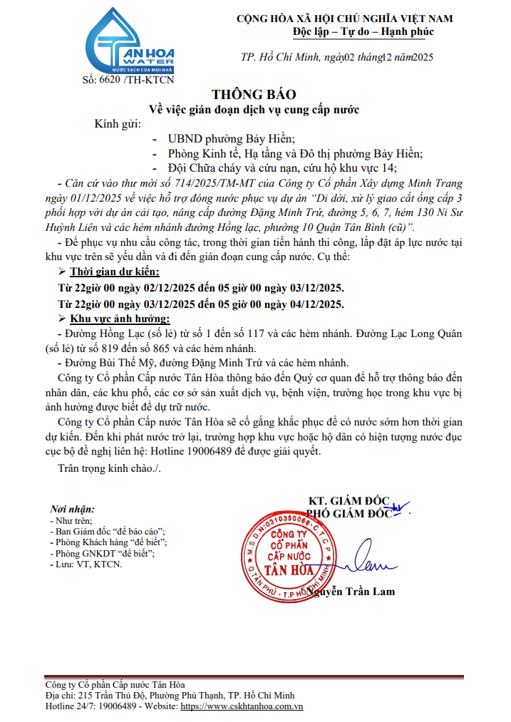Công ty Cổ phần Cấp nước Tân Hòa hỗ trợ đóng nước phục vụ dự án “Di dời, xử lý giao cắt ống cấp 3 phối hợp với dự án cải tạo, nâng cấp đường Đặng Minh Trứ, đường 5, 6, 7, hẻm 130 Ni Sư Huỳnh Liên và các hẻm nhánh đường Hồng lạc, phường 10 Quận Tân Bình (cũ)”. Để phục vụ nhu cầu công tác, trong thời gian tiến hành thi công, lắp đặt áp lực nước tại khu vực trên sẽ yếu dần và đi đến gián đoạn cung cấp nước.