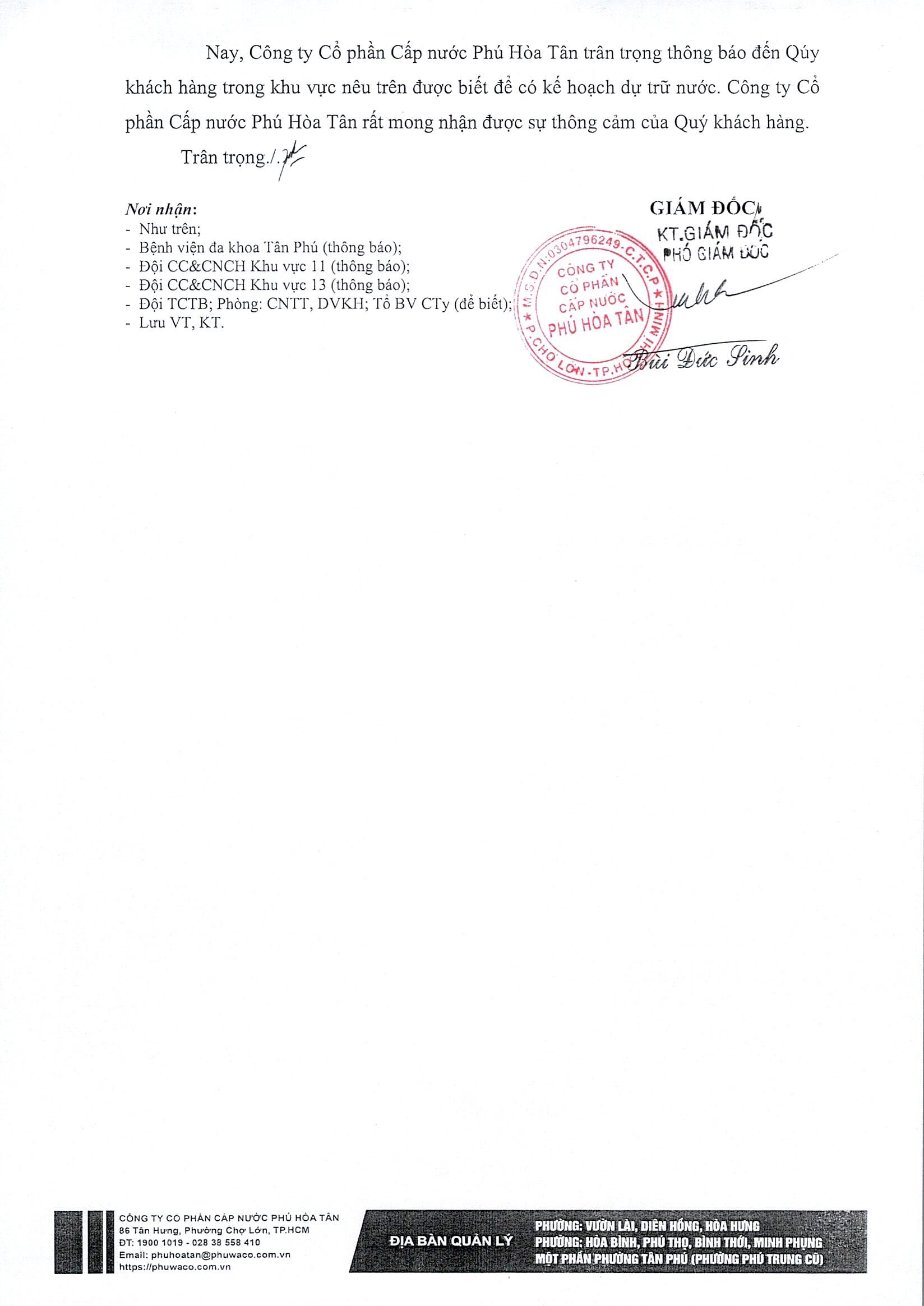 Công ty Cổ phần Cấp nước Phú Hòa Tân trân trọng thông báo Quý khách hàngđược biết để có kế hoạch dự trữ nước phục vụ cho sản xuất và sinh hoạt. Công tyrất mong nhận được sự thông cảm của Quý khách hàng./