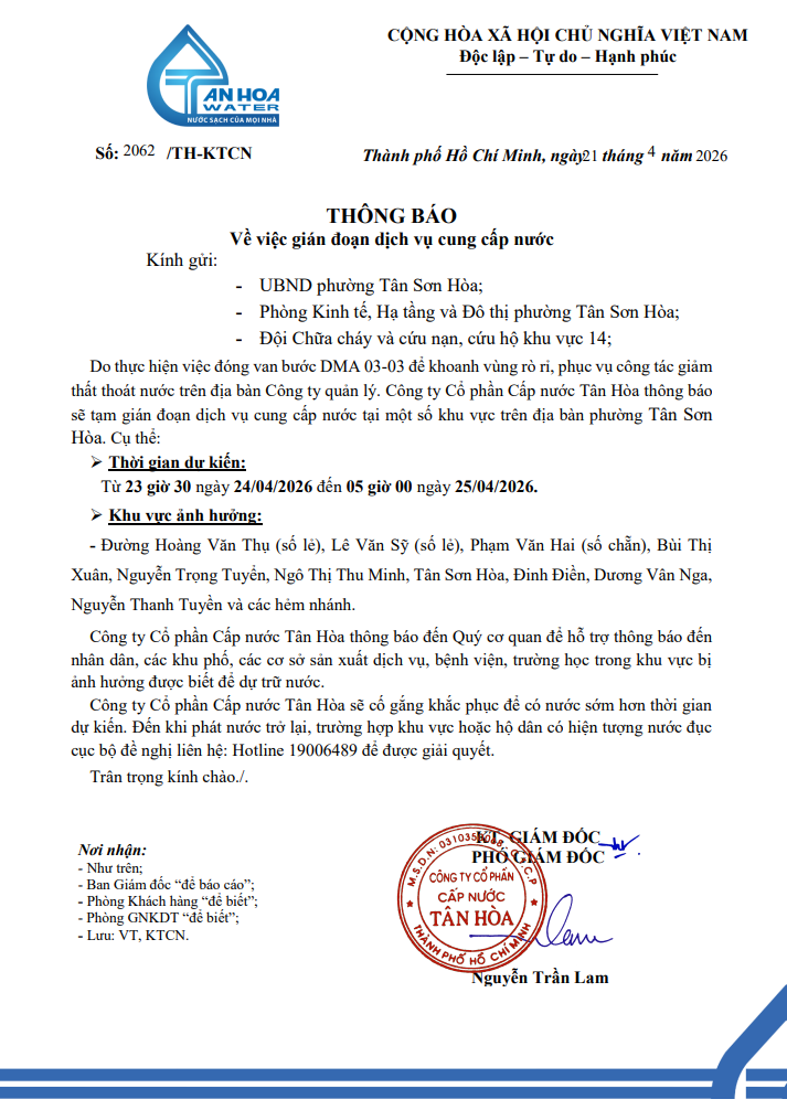 Công ty Cổ phần Cấp nước Tân Hòa thực hiện việc đóng van bước DMA 03-03 để khoanh vùng rò rỉ, phục vụ công tác giảm thất thoát nước trên địa bàn Công ty quản lý. Công ty Cổ phần Cấp nước Tân Hòa thông báo sẽ tạm gián đoạn dịch vụ cung cấp nước tại một số khu vực trên địa bàn phường Tân Sơn Hòa.
