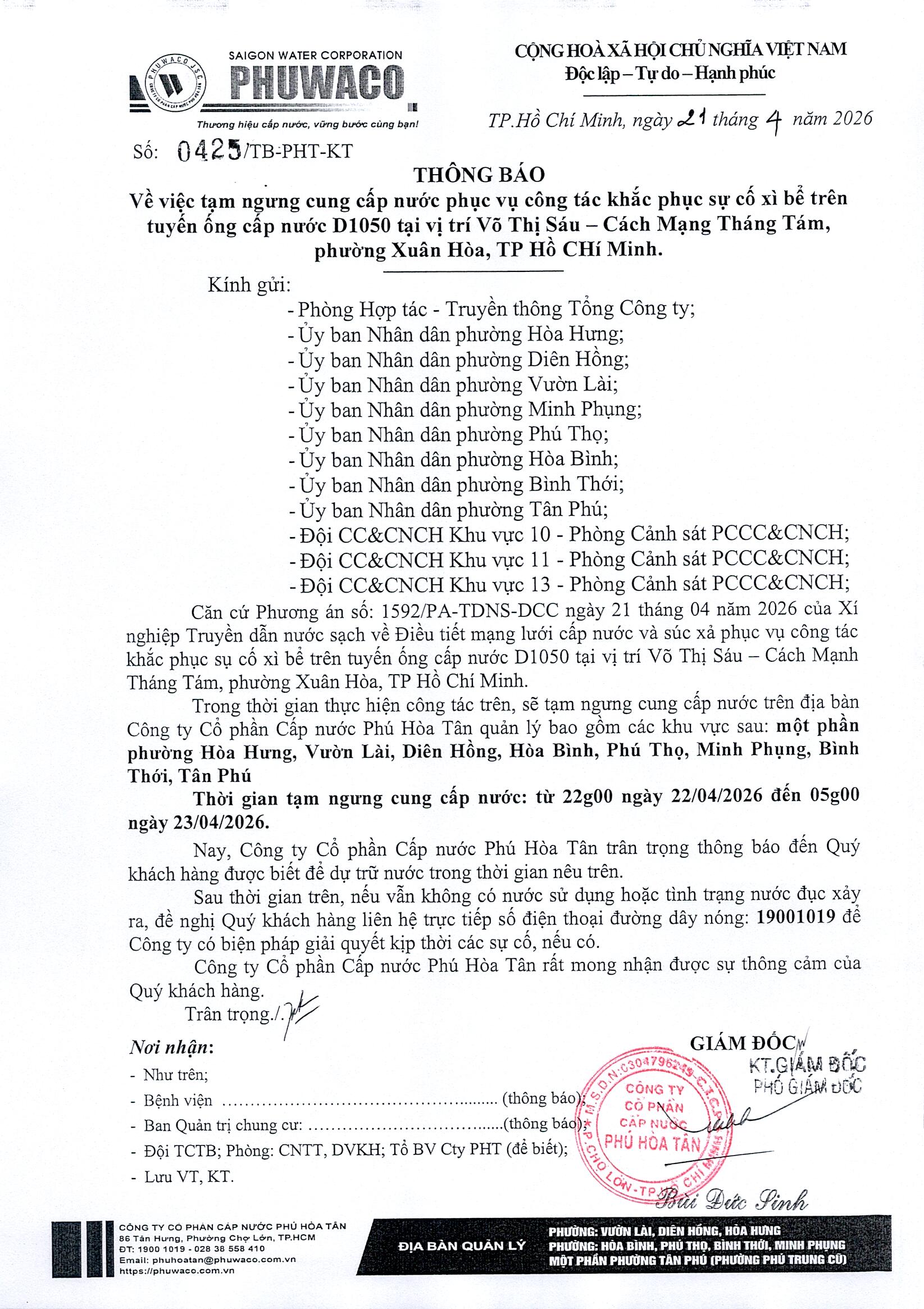 Công ty Cổ phần Cấp nước Phú Hòa Tân trân trọng thông báo Quý khách hàngđược biết để có kế hoạch dự trữ nước phục vụ cho sản xuất và sinh hoạt. Công tyrất mong nhận được sự thông cảm của Quý khách hàng./