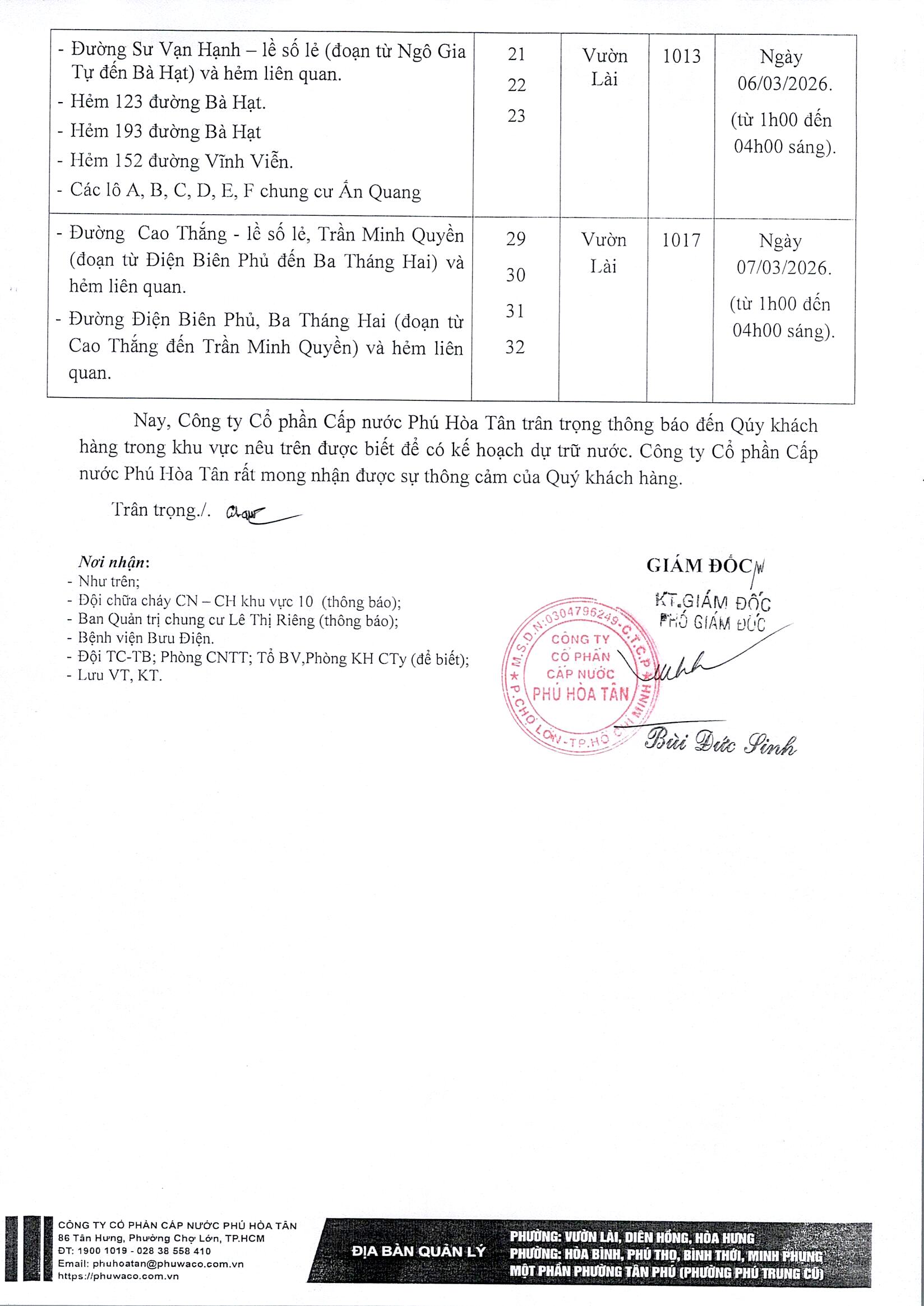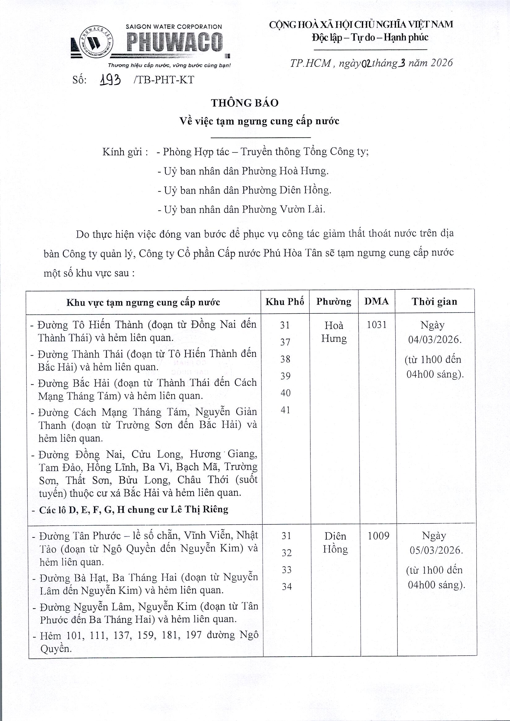 Ảnh: Thông báo tạm ngưng cung cấp nước phường Hoà Hưng, Diên Hồng, Vườn Lài từ 01g00 đến 04g00 các ngày  04, 05, 06, 07/3/2026