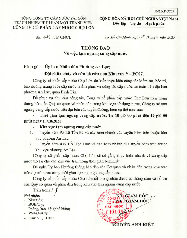 Lịch thông báo tạm ngưng cung cấp nước khu vực thuộc phường AN LẠC từ 10g00 - 16g00 ngày 17/10/2025