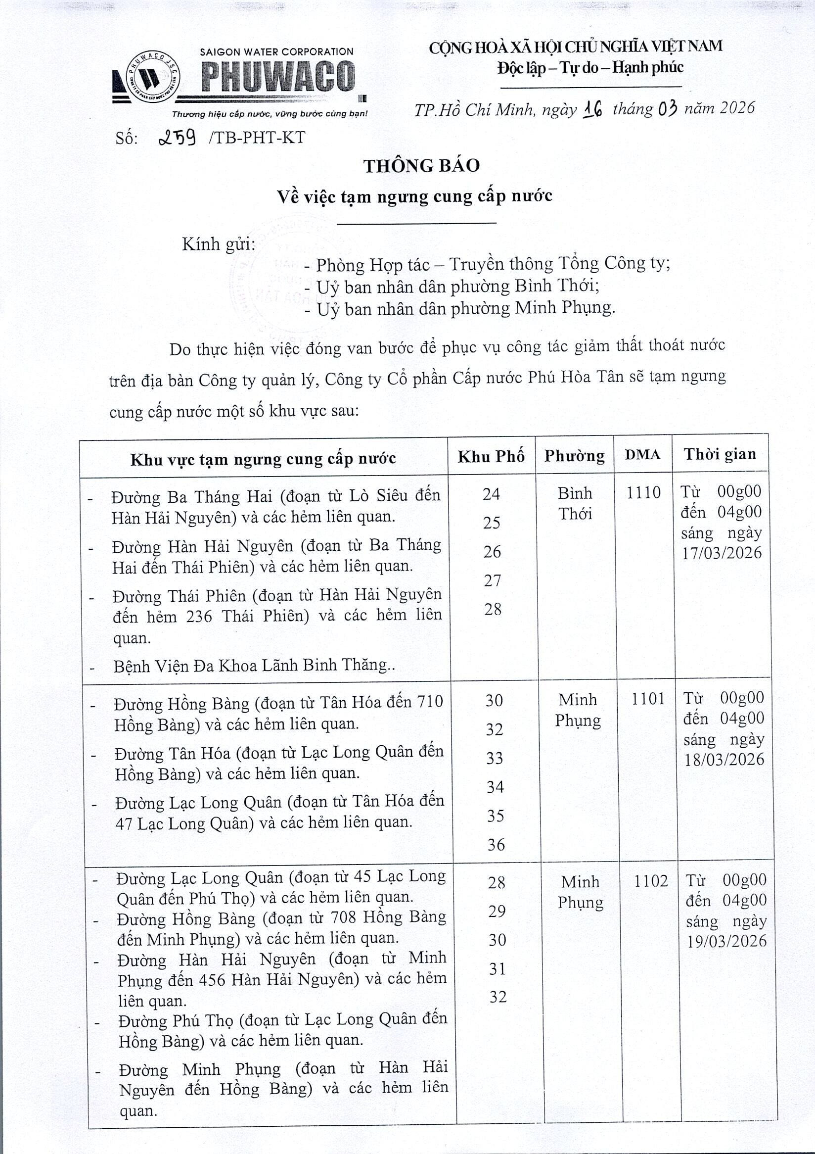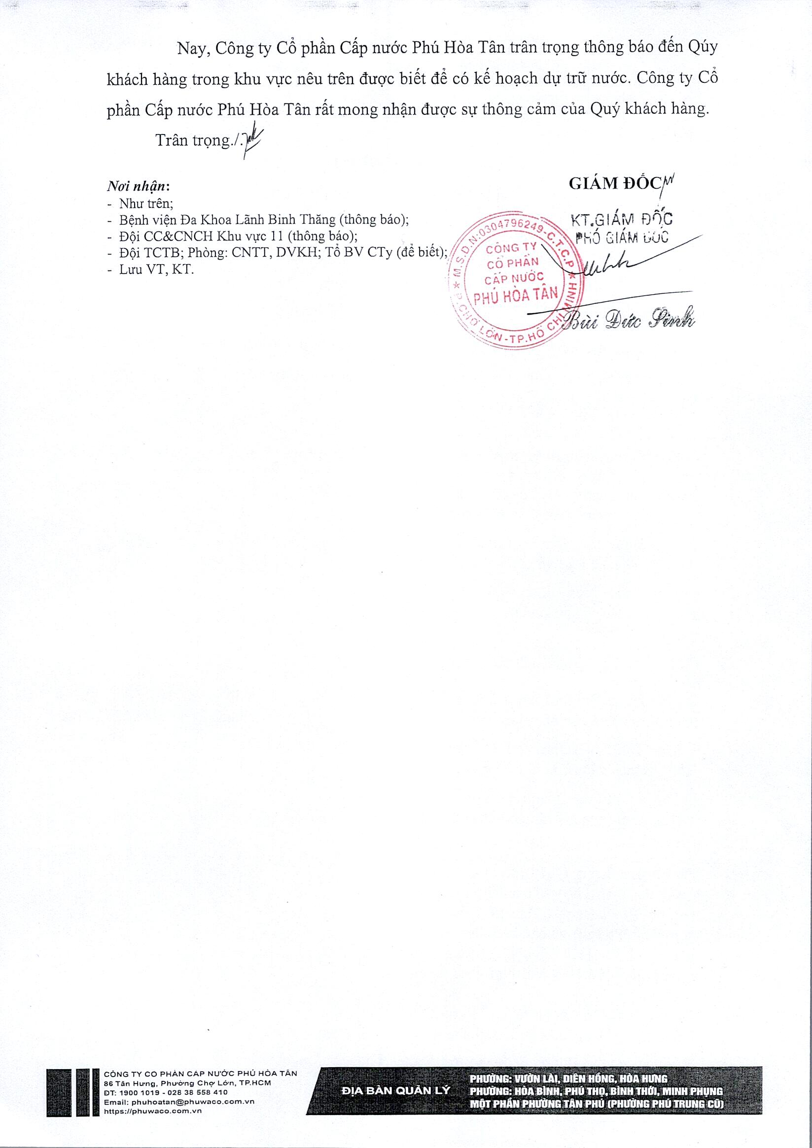Công ty Cổ phần Cấp nước Phú Hòa Tân trân trọng thông báo Quý khách hàngđược biết để có kế hoạch dự trữ nước phục vụ cho sản xuất và sinh hoạt. Công tyrất mong nhận được sự thông cảm của Quý khách hàng./