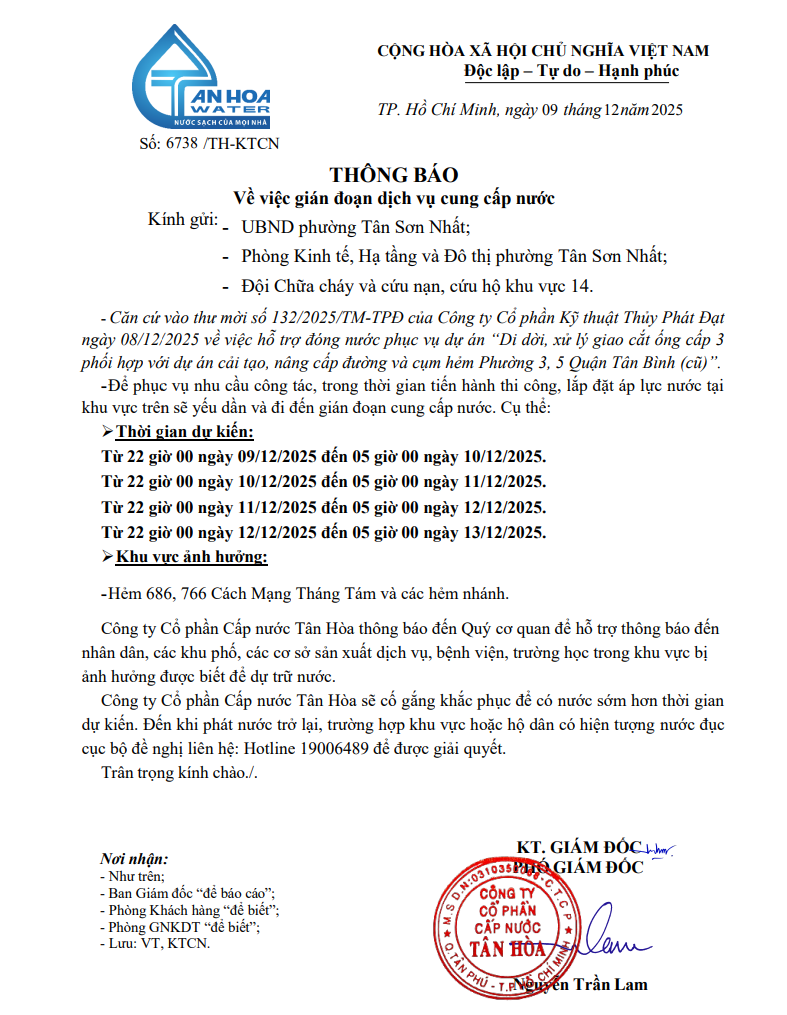 Công ty Cổ phần Cấp nước Tân Hòa hỗ trợ đóng nước phục vụ dự án “Di dời, xử lý giao cắt ống cấp 3 phối hợp với dự án cải tạo, nâng cấp đường và cụm hẻm Phường 3, 5 Quận Tân Bình (cũ)”.Để phục vụ nhu cầu công tác, trong thời gian tiến hành thi công, lắp đặt áp lực nước tại khu vực trên sẽ yếu dần và đi đến gián đoạn cung cấp nước.