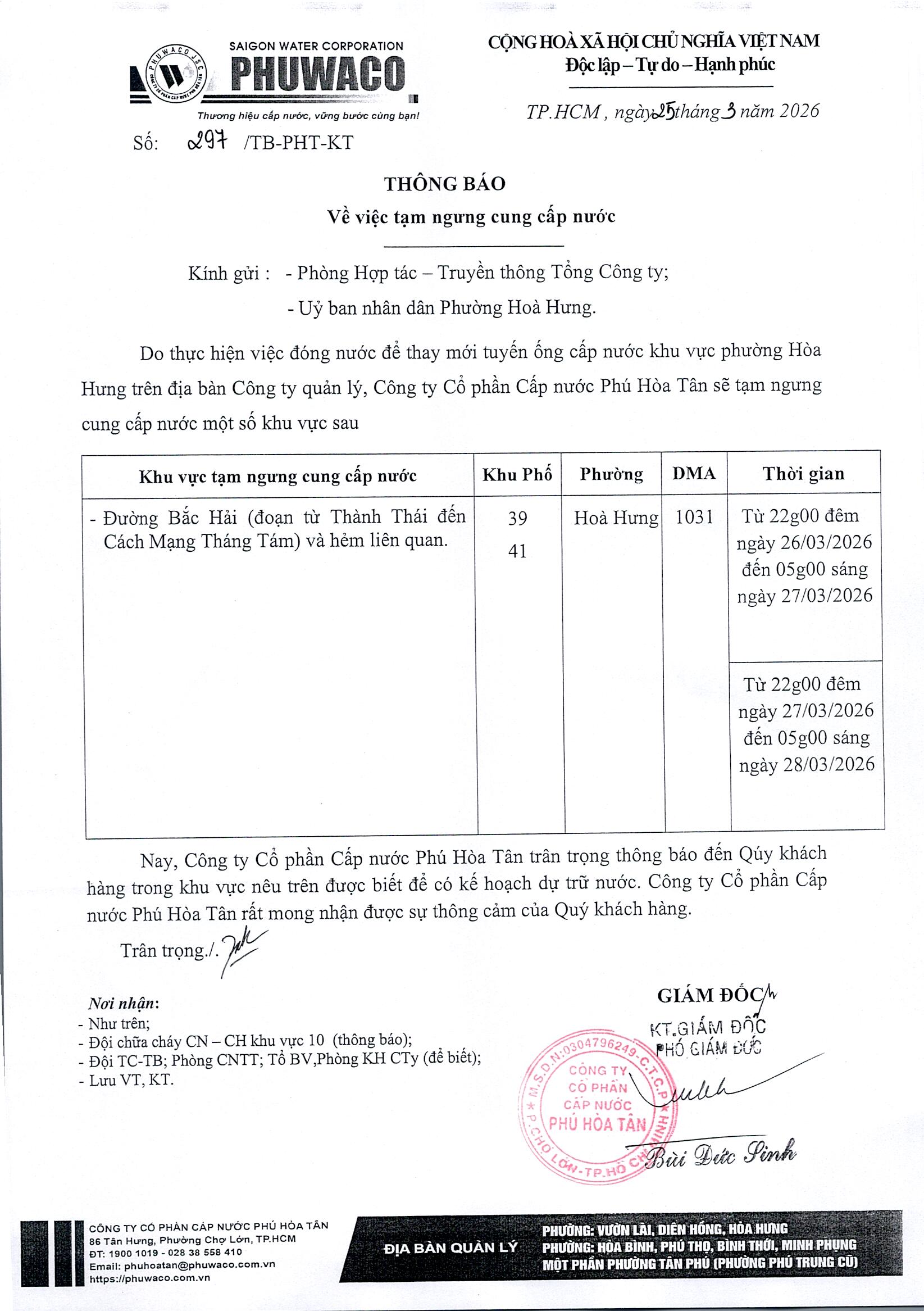 Công ty Cổ phần Cấp nước Phú Hòa Tân trân trọng thông báo Quý khách hàngđược biết để có kế hoạch dự trữ nước phục vụ cho sản xuất và sinh hoạt. Công tyrất mong nhận được sự thông cảm của Quý khách hàng./