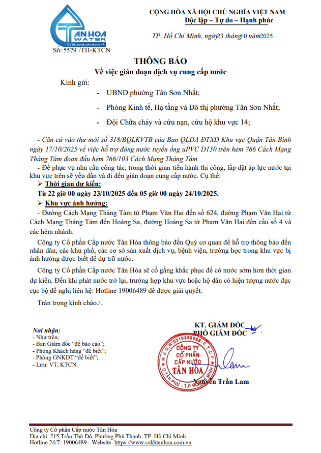 CTCP CN Tân Hòa chân thành xin lỗi Quý khách hàng về sự bất tiện này. Quý khách nên chủ động trong việc sử dụng và dự trữ nước trong thời gian tạm ngưng cung cấp nước.