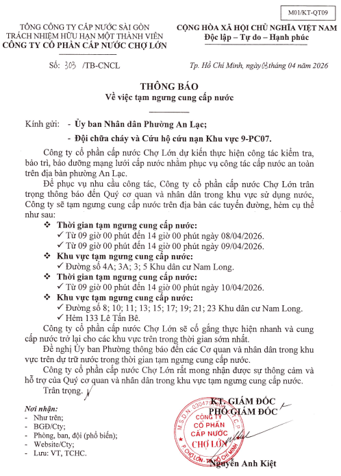 CTCP CN Chợ lớn chân thành xin lỗi Quý khách hàng về sự bất tiện này. Quý khách nên chủ động trong việc sử dụng và dự trữ nước trong thời gian tạm ngưng cung cấp nước.