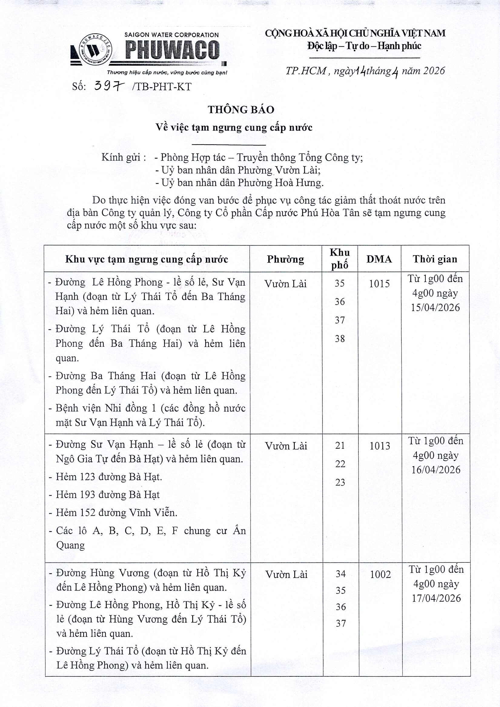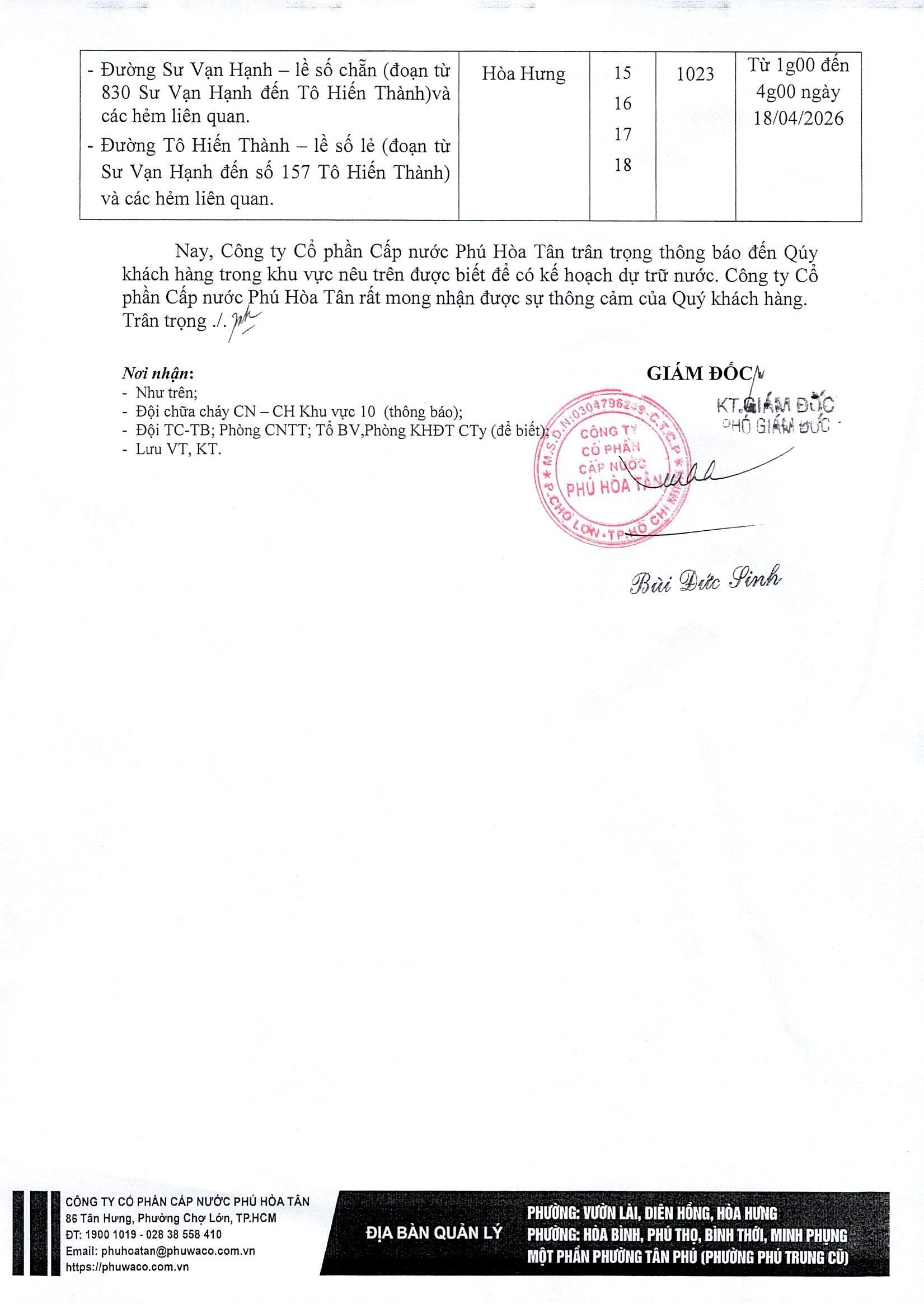 Công ty Cổ phần Cấp nước Phú Hòa Tân trân trọng thông báo Quý khách hàngđược biết để có kế hoạch dự trữ nước phục vụ cho sản xuất và sinh hoạt. Công tyrất mong nhận được sự thông cảm của Quý khách hàng./