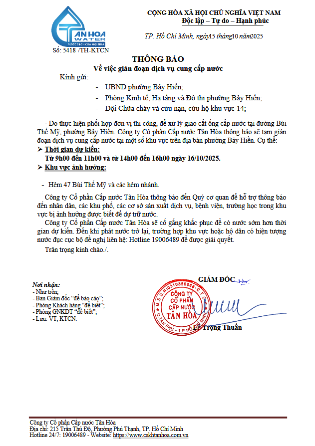 Công ty Cổ phần Cấp nước Tân Hòa thực hiện phối hợp đơn vị thi công, để xử lý giao cắt ống cấp nước tại đường Bùi Thế Mỹ, phường Bảy Hiền. Công ty Cổ phần Cấp nước Tân Hòa thông báo sẽ tạm gián đoạn dịch vụ cung cấp nước tại một số khu vực trên địa bàn phường Bảy Hiền.