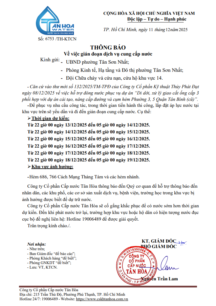 Công ty Cổ phần Cấp nước Tân Hòa hỗ trợ đóng nước phục vụ dự án “Di dời, xử lý giao cắt ống cấp 3phối hợp với dự án cải tạo, nâng cấp đường và cụm hẻm Phường 3, 5 Quận Tân Bình (cũ)”. Để phục vụ nhu cầu công tác, trong thời gian tiến hành thi công, lắp đặt áp lực nước tại khu vực trên sẽ yếu dần và đi đến gián đoạn cung cấp nước.