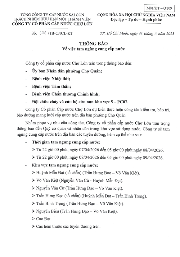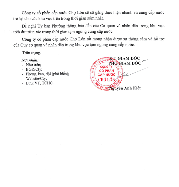 CTCP CN Chợ lớn chân thành xin lỗi Quý khách hàng về sự bất tiện này. Quý khách nên chủ động trong việc sử dụng và dự trữ nước trong thời gian tạm ngưng cung cấp nước.